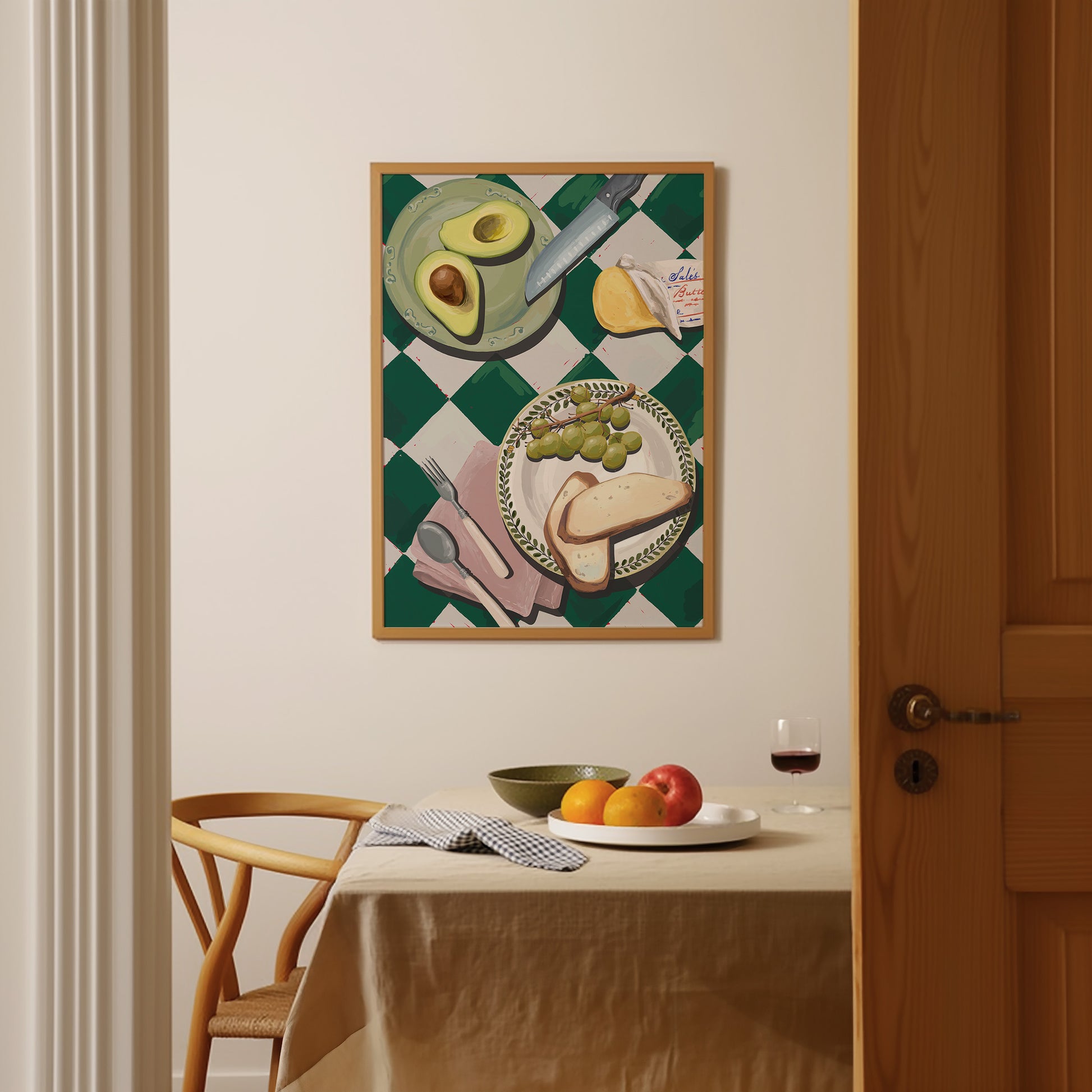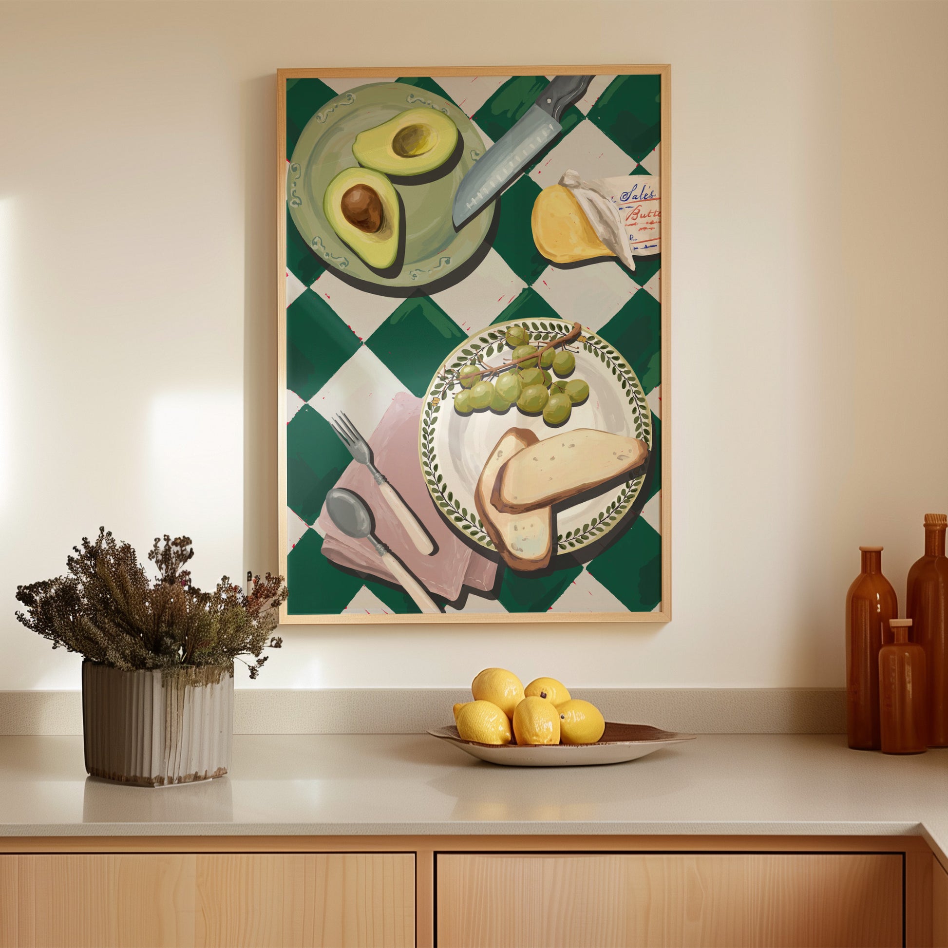 A fresh, sunlit kitchen scene with ripe avocado, crusty bread, green grapes, and butter wrapped in paper. Set against a bold green check tablecloth for that classic Mediterranean touch. Playful yet refined, this print adds warmth and color to kitchens, dining spaces, or food-inspired gallery walls.