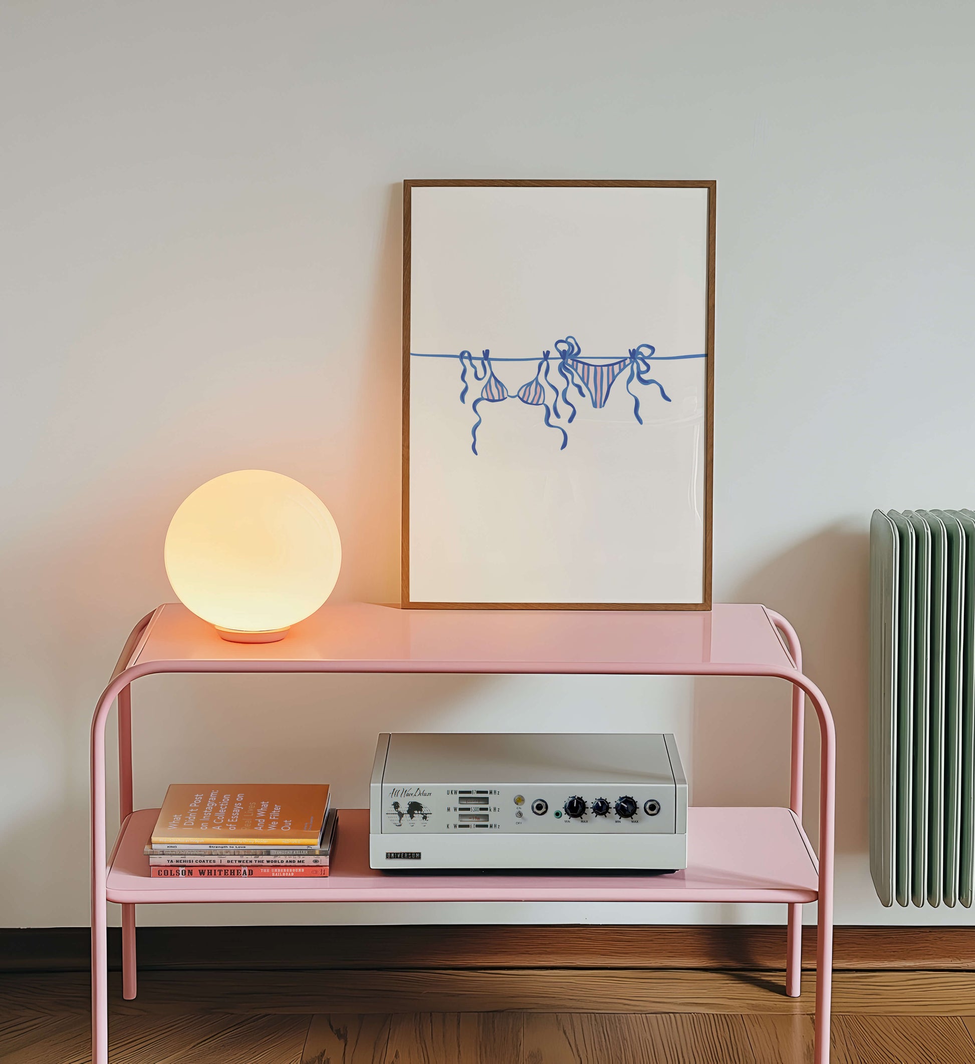 Bring summer energy into your space with this minimalist bikini poster. Featuring a playful blue and pink striped bikini illustrated as a single line drawing on a soft background, this art piece adds a fun, beachy vibe to bedrooms, bathrooms, or gallery walls. Style it solo or mix with other summer prints.