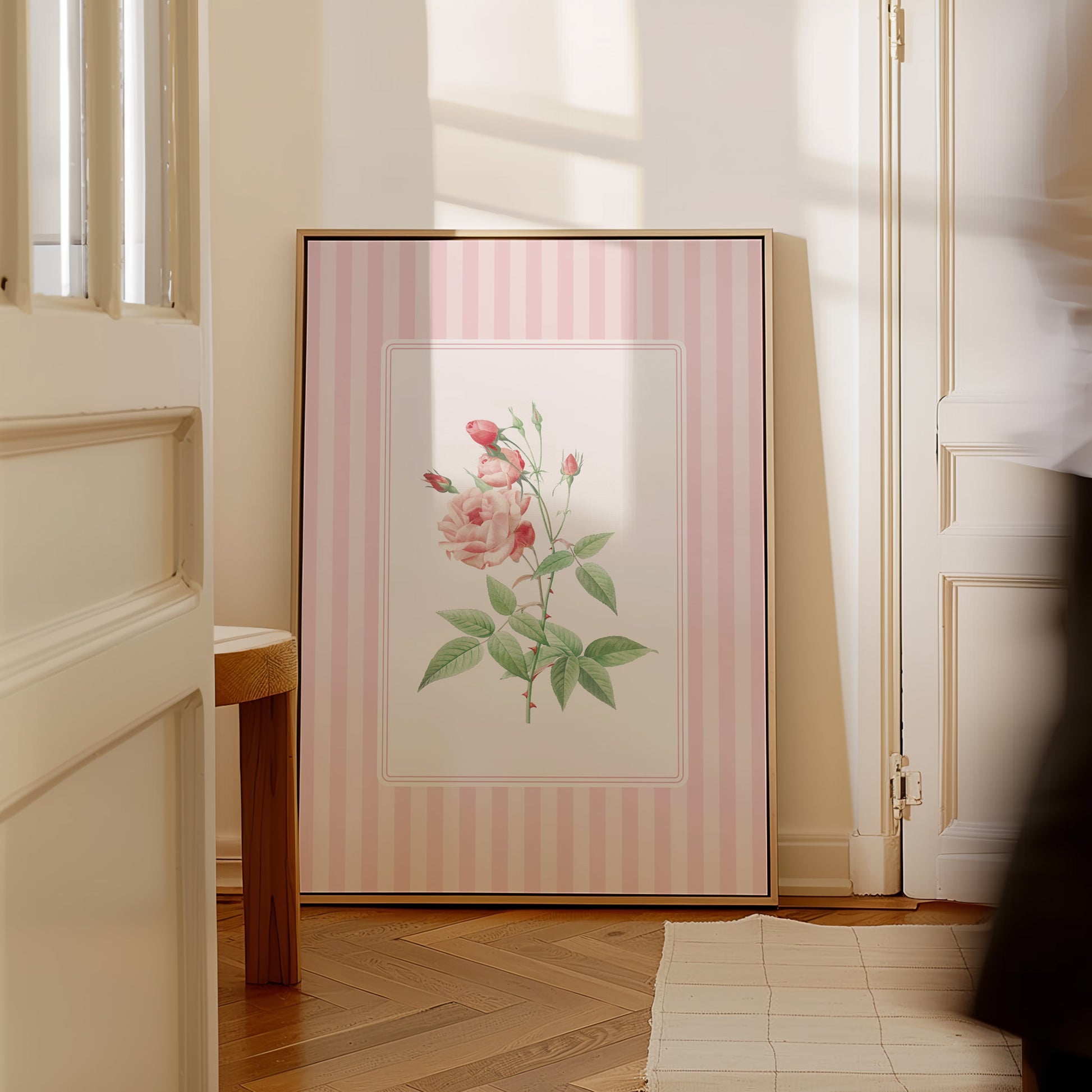 A vintage-style botanical print showcasing a soft pink rose in bloom, framed by a delicate double border and a blush striped background. Gentle and timeless. Lovely for nurseries, kids’ rooms, or nature inspired spaces.