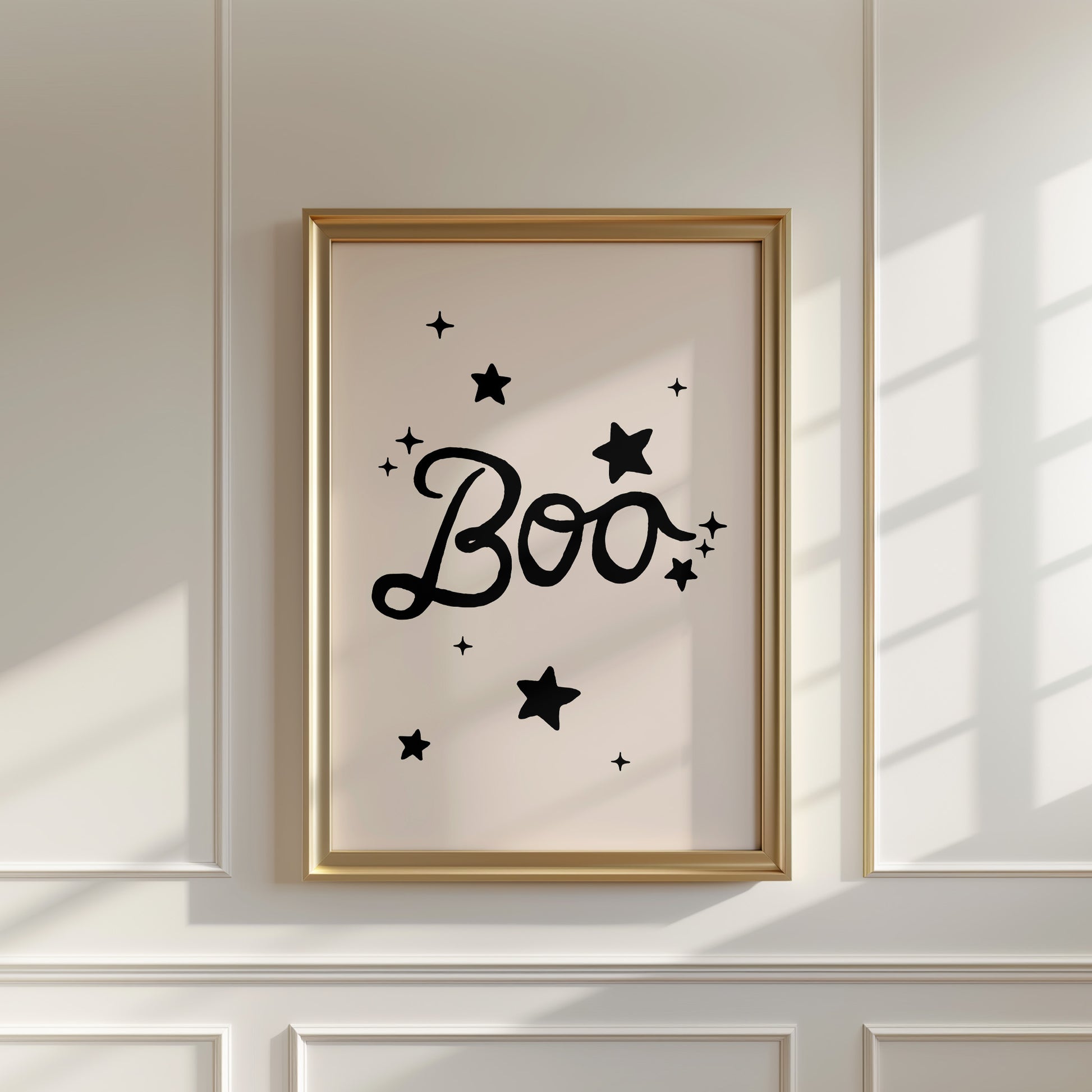 Our “Boo” wall art is Halloween at its most charming—playful hand lettering with a sprinkle of stars, all in a modern black and cream palette. The perfect print for adding a little spooky cheer to your home, office, or kids’ space, without going over the top.