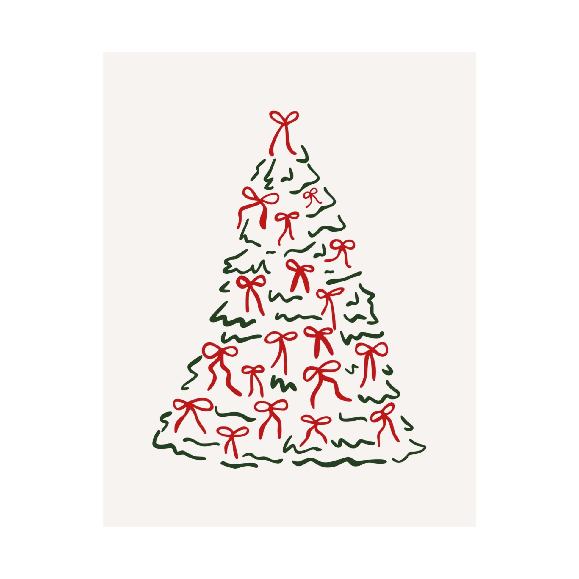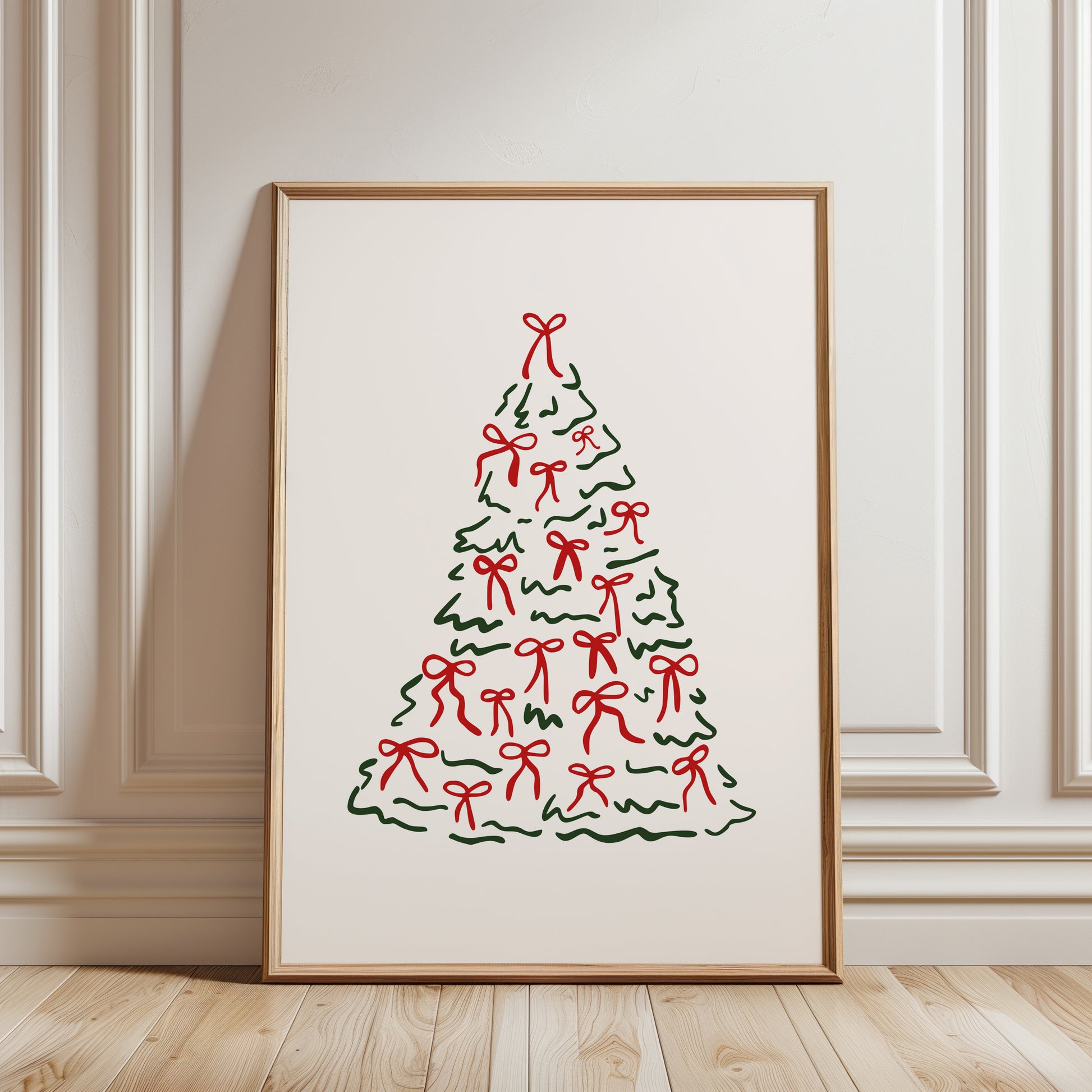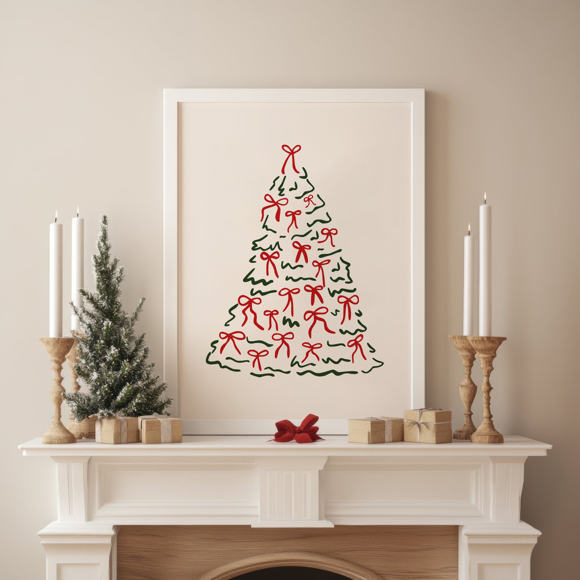 A charming twist on holiday decor! This minimalist Christmas tree illustration is decked out in fluttery red bows and festive flair. With hand drawn lines and a clean background, it's the perfect blend of classic and playful for your holiday home, gift table, or seasonal gallery wall.