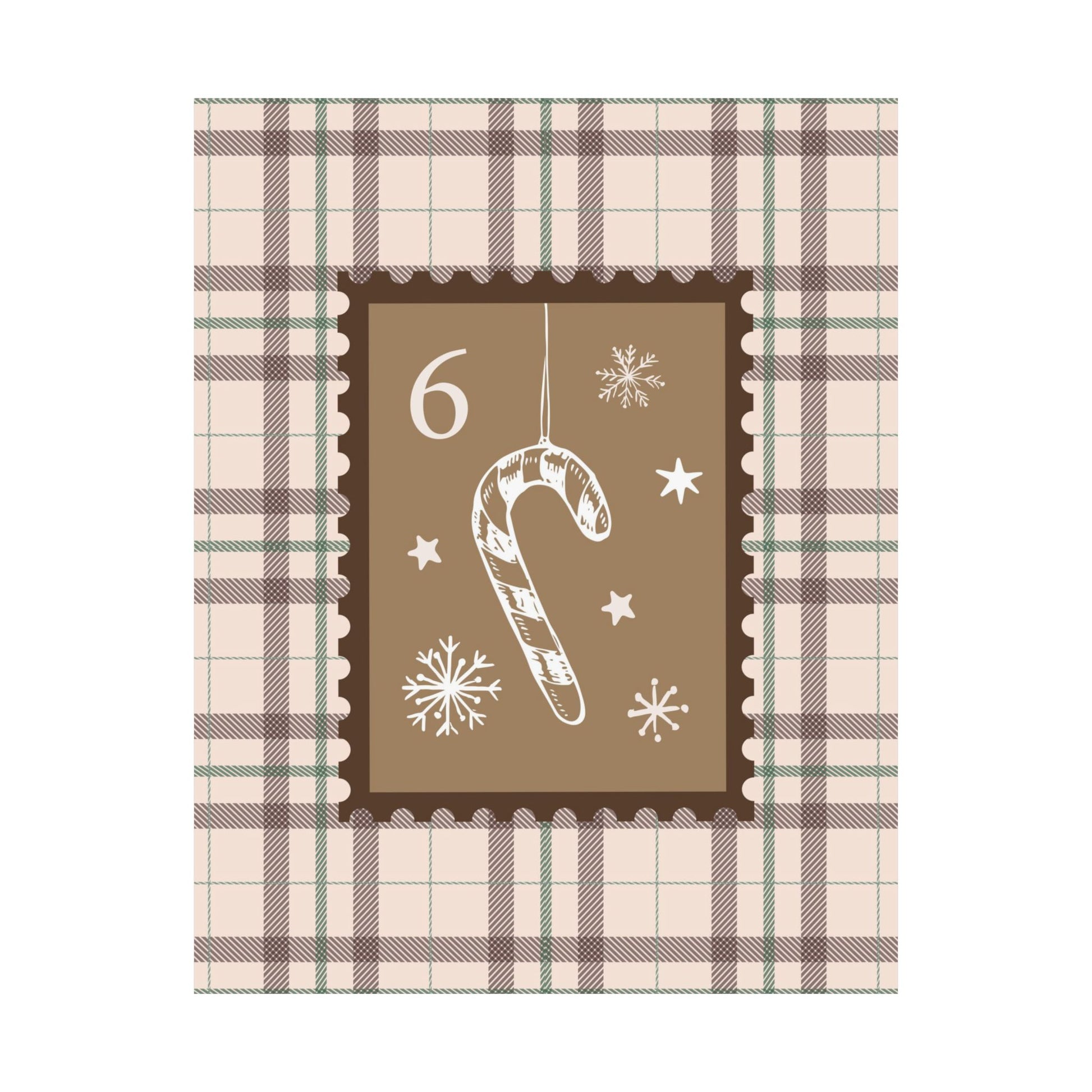 Sweeten your holiday wall with this candy cane illustration framed like a vintage postage stamp. With snowy stars, soft neutrals, and classic plaid, it’s the perfect piece to add charm to any corner of your Christmas home.