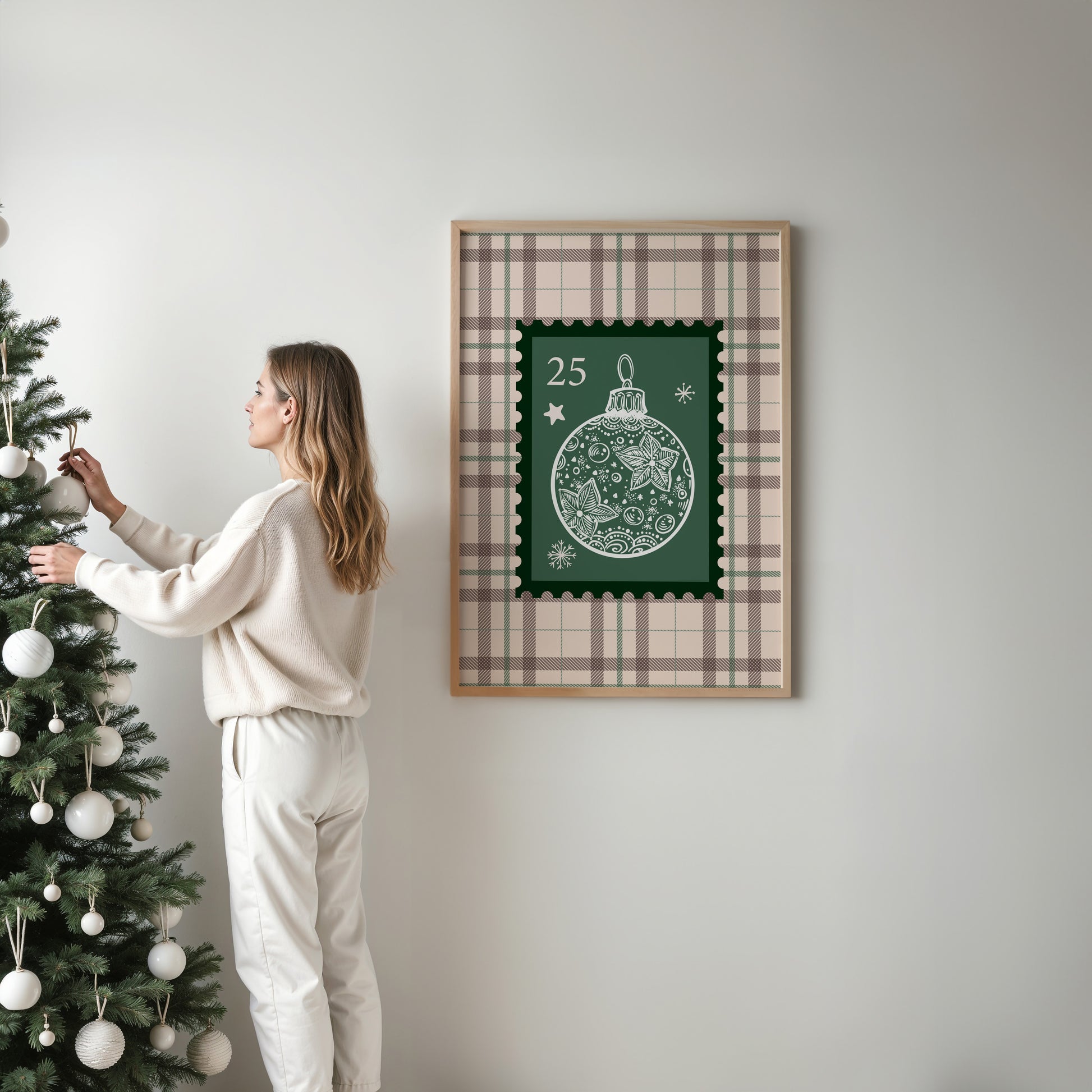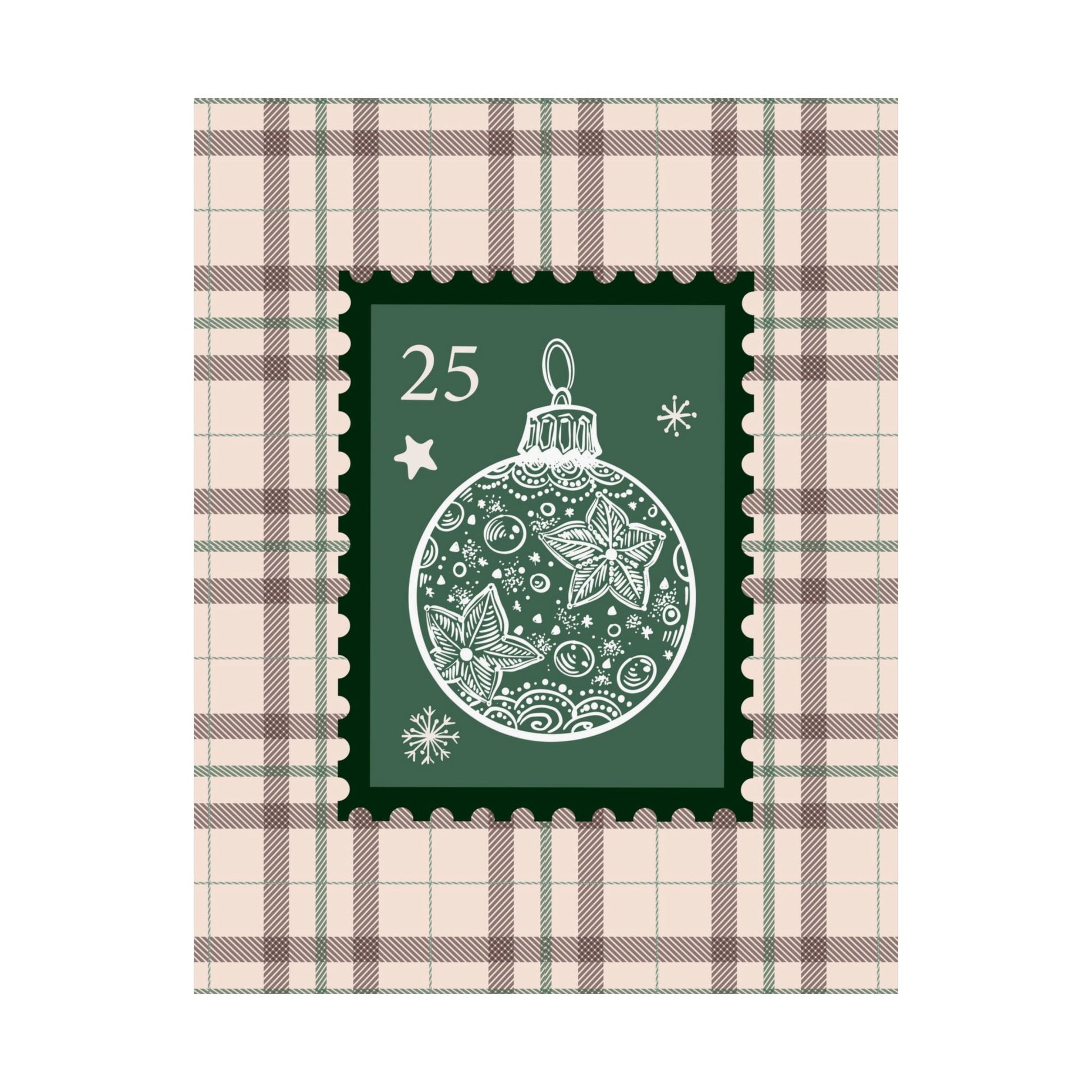 Add a little sparkle to your space with this intricate ornament illustration, nestled inside a postage stamp frame. With forest green tones and a classic holiday plaid background, it brings cozy and classy together in perfect harmony.