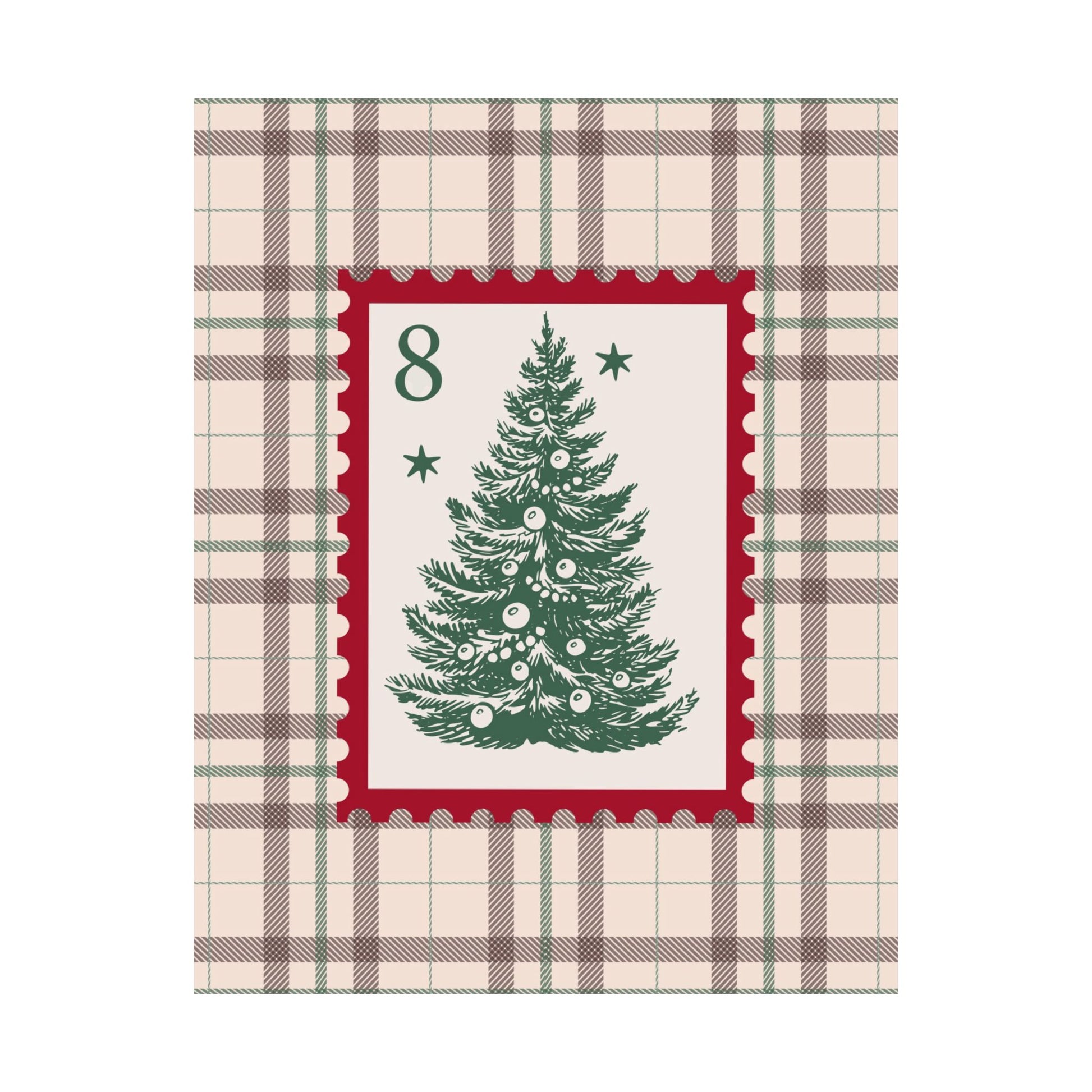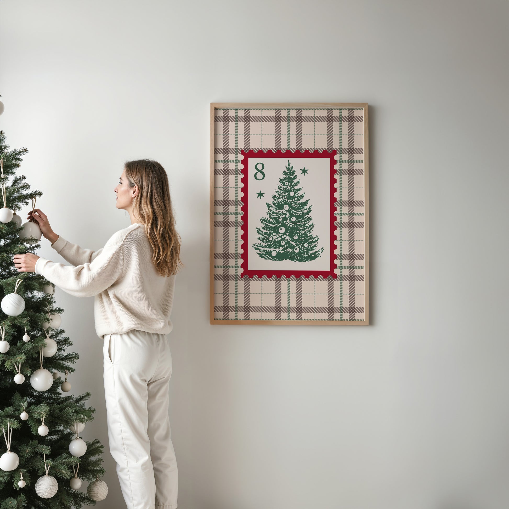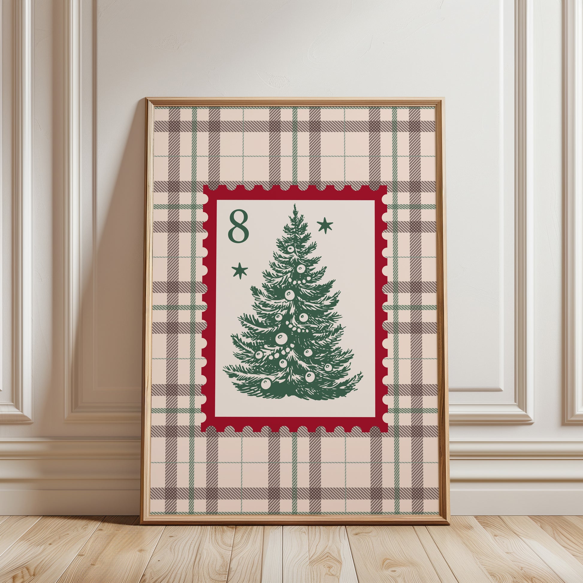 Bring in the holiday cheer with this illustrated Christmas tree art, styled like a retro stamp and framed in traditional plaid. Perfect for a gallery wall, entryway, or mantle for that "just mailed from the North Pole" feel.