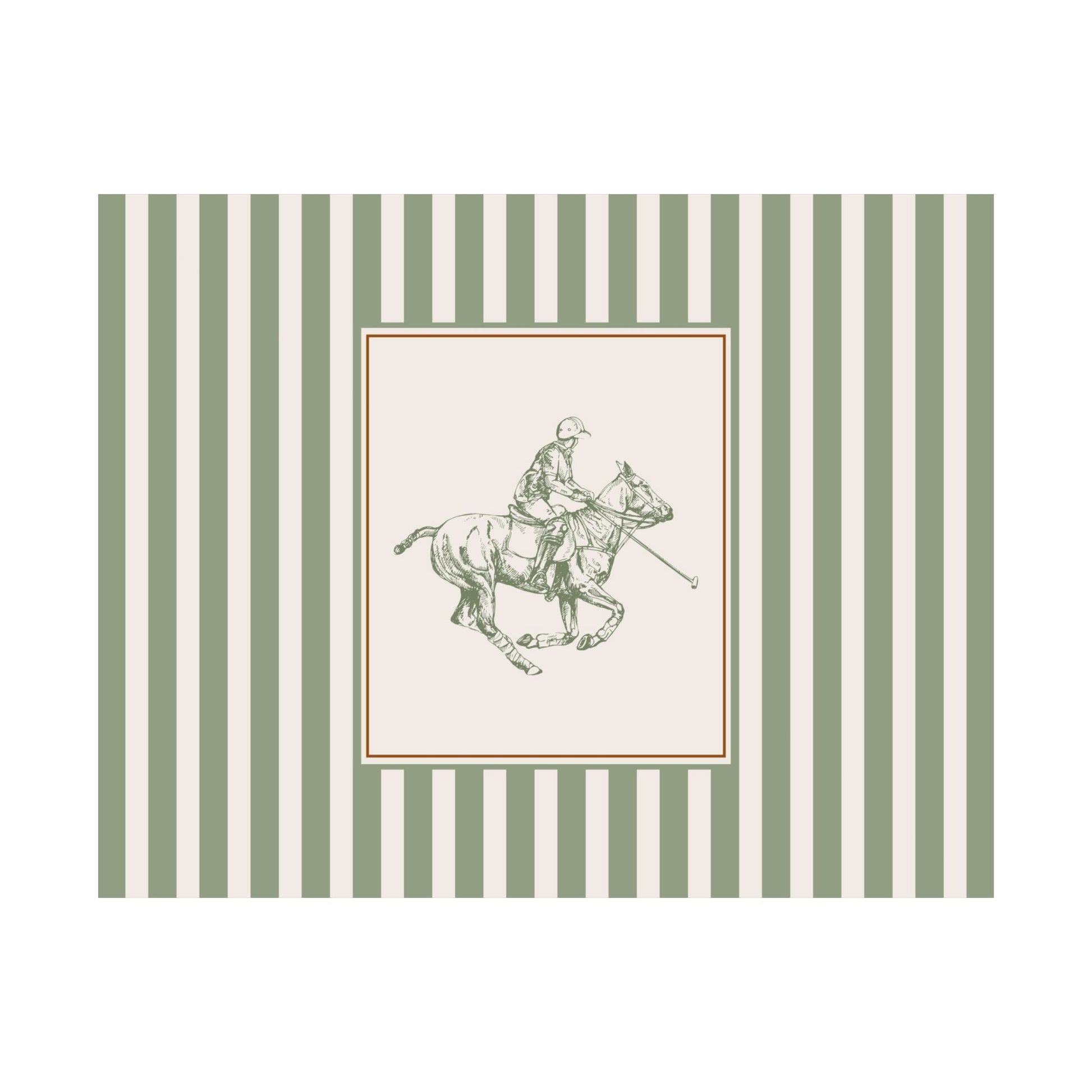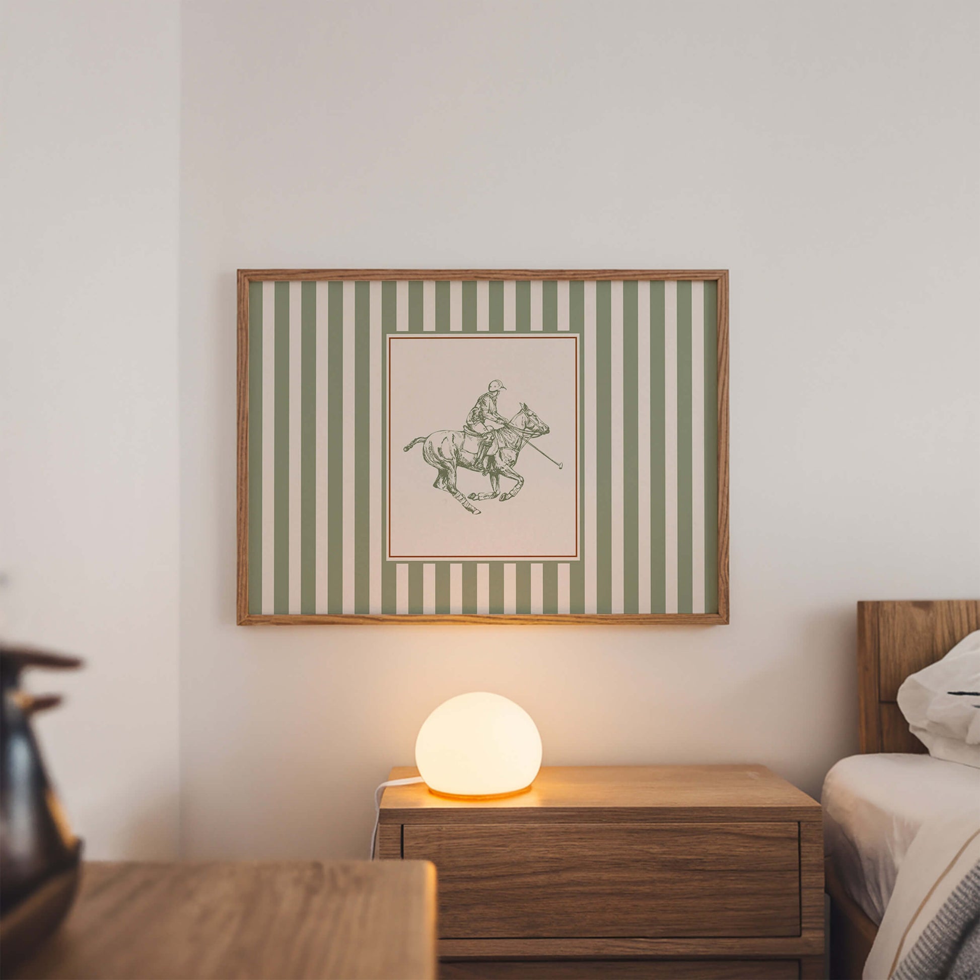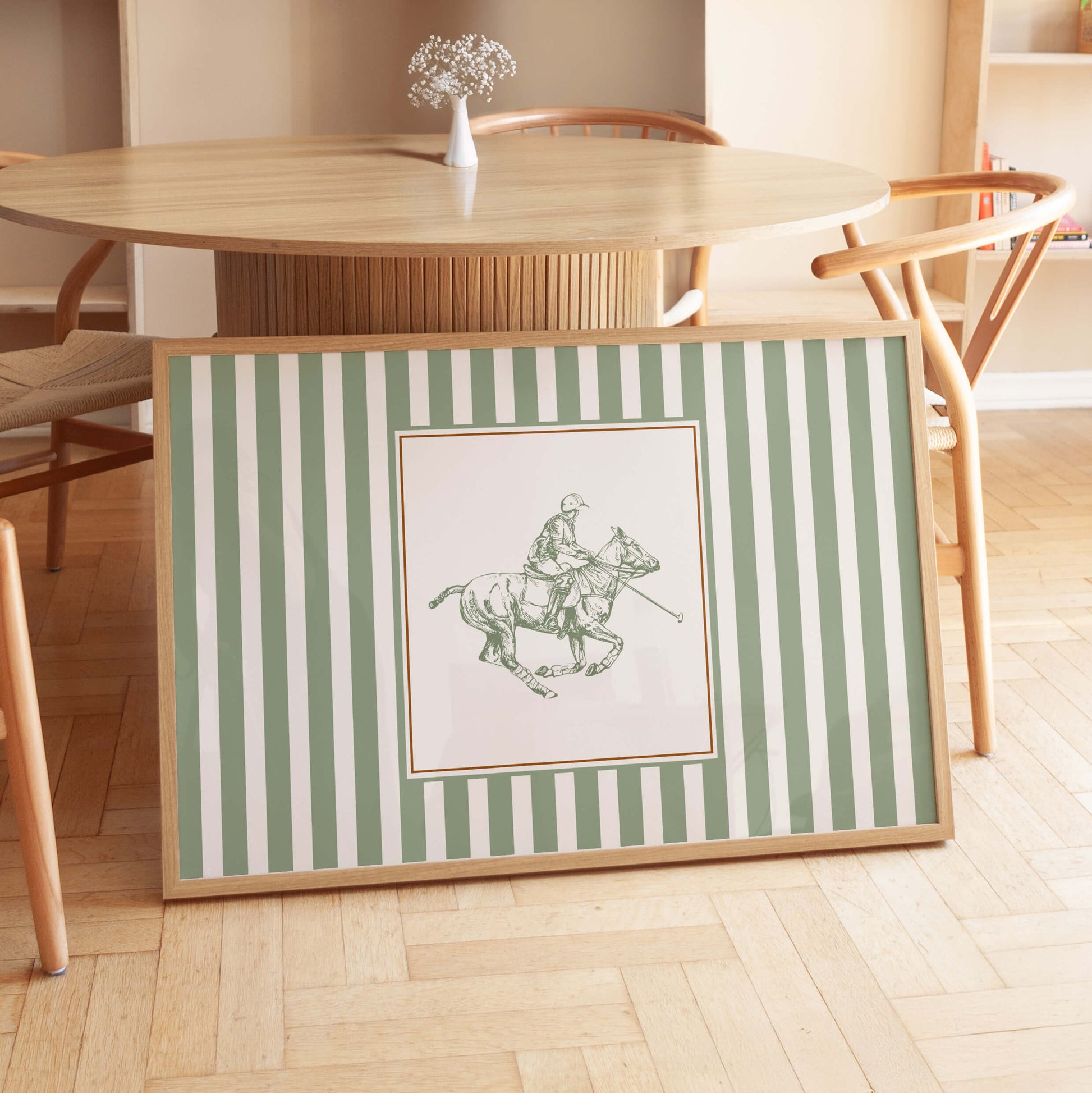 Bring a touch of timeless equestrian elegance to your walls with this vintage-inspired polo rider artwork. The hand drawn illustration captures the spirit of the sport in soft green tones, framed by classic vertical stripes and a warm cream background. A refined addition to offices, studies, or a polo themed nursery.