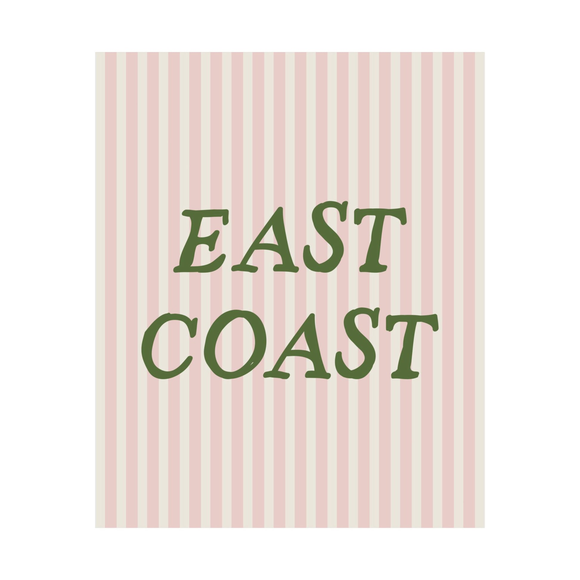 A love letter to coastal charm. This vintage-style "East Coast" poster features bold olive green serif lettering on a soft pink striped background. Whether you're a beach-town regular or just love a good nautical nod, this artwork brings laid-back sophistication to any space. Perfect for gallery walls, dorm rooms, or summer home vibes.