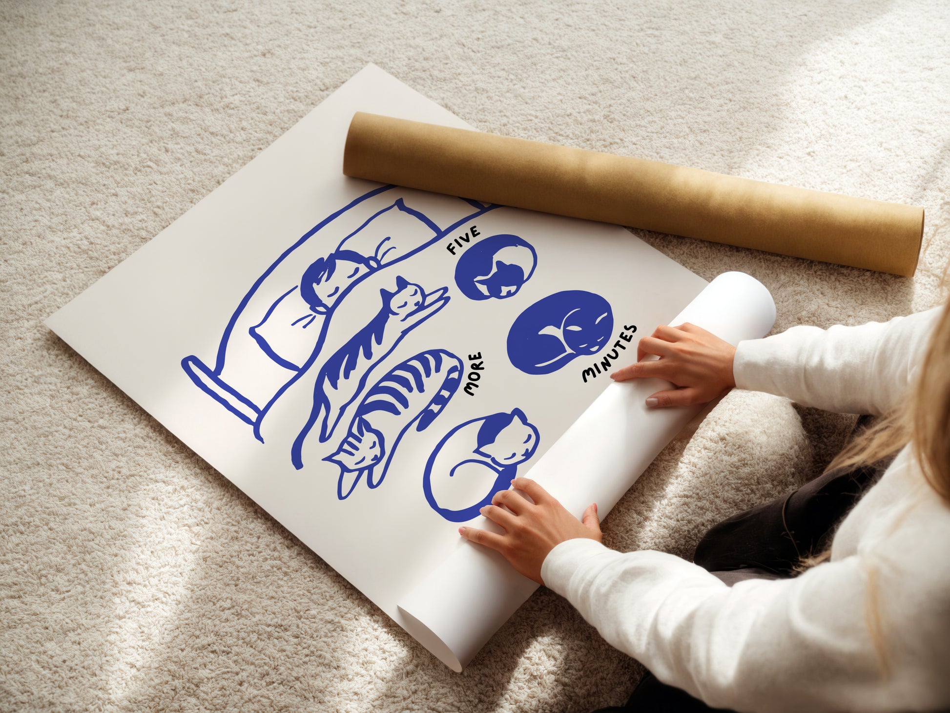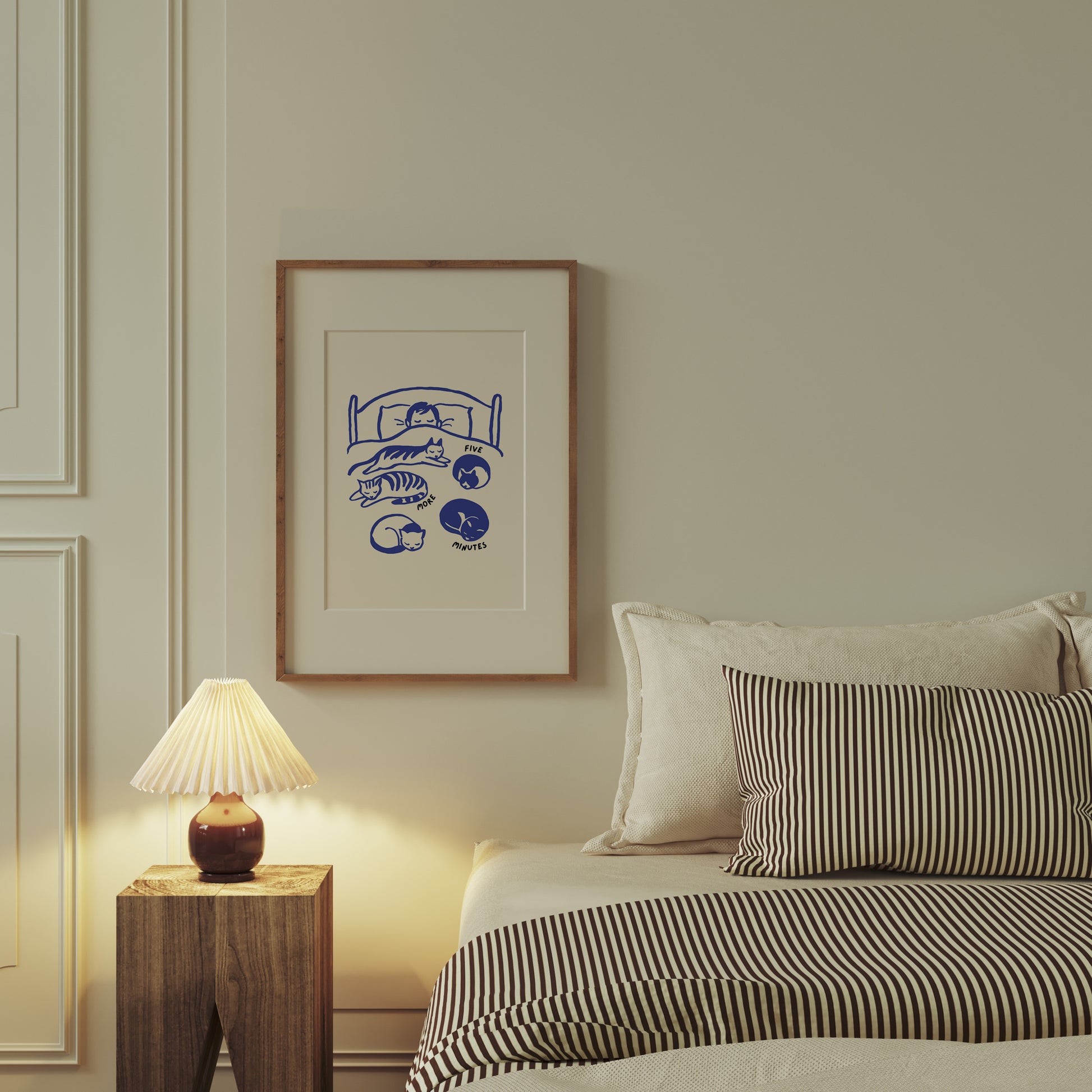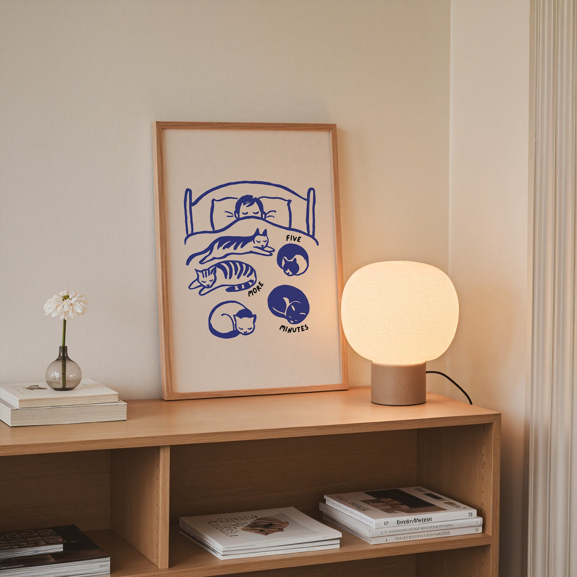 A sweet and sleepy moment, captured in bold blue lines. This playful art print features a cozy bed scene surrounded by napping cats, the universal mood of “just five more minutes.” Soft, simple, and full of charm, it brings a gentle sense of calm to any space