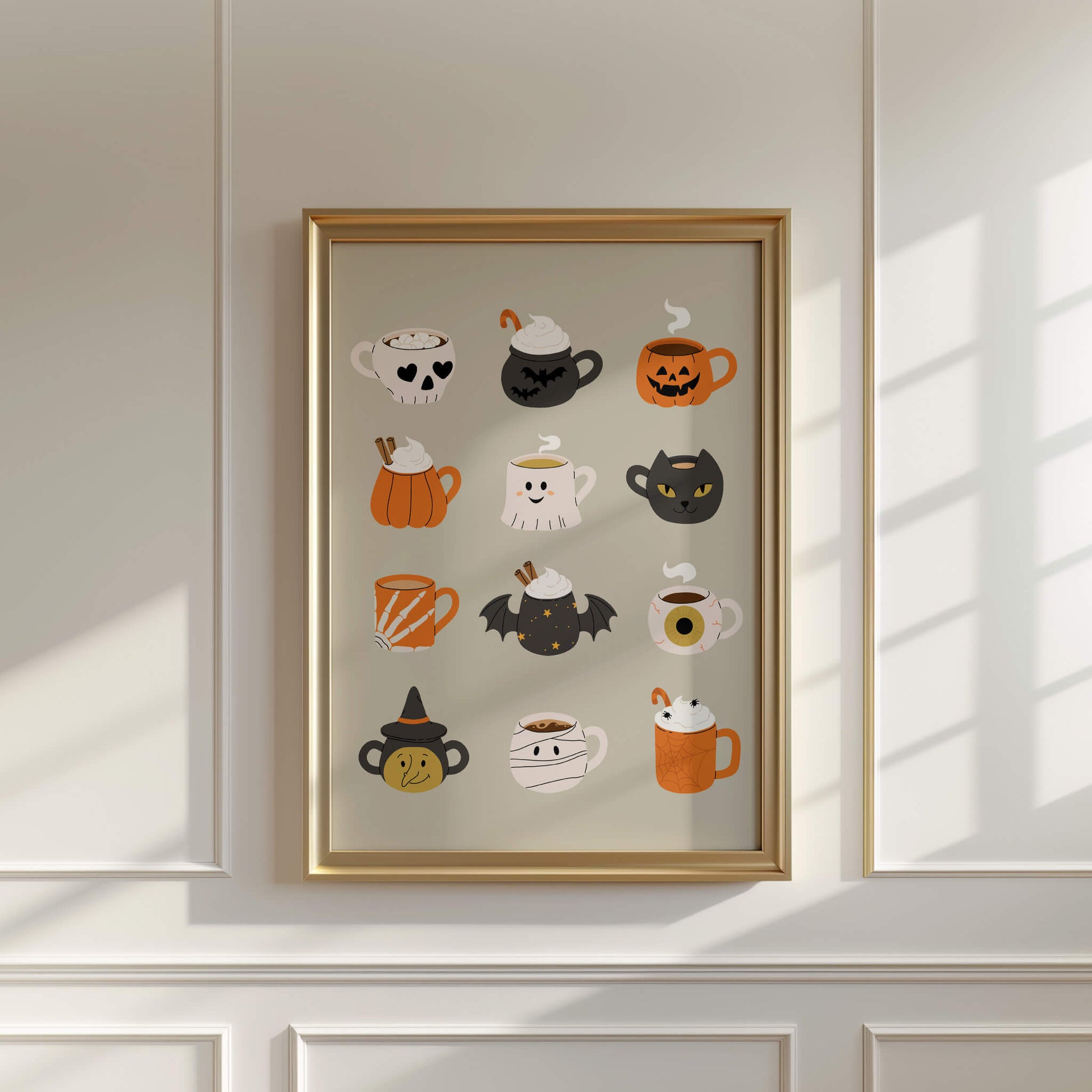 Our Halloween Mug Collection poster features a playful parade of spooky mugs—pumpkins, black cats, ghosts, and more. This cheerful artwork is the perfect way to bring a little Halloween magic to your kitchen, coffee bar, or breakfast nook.