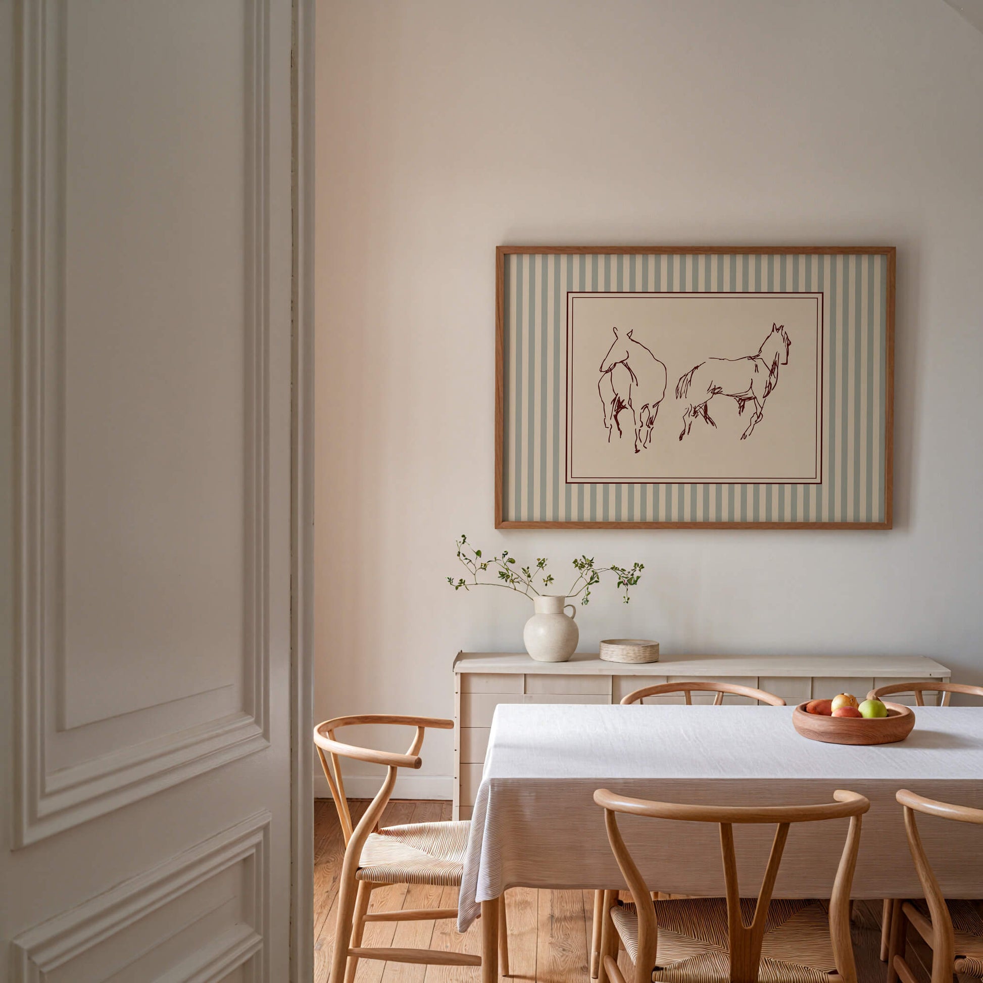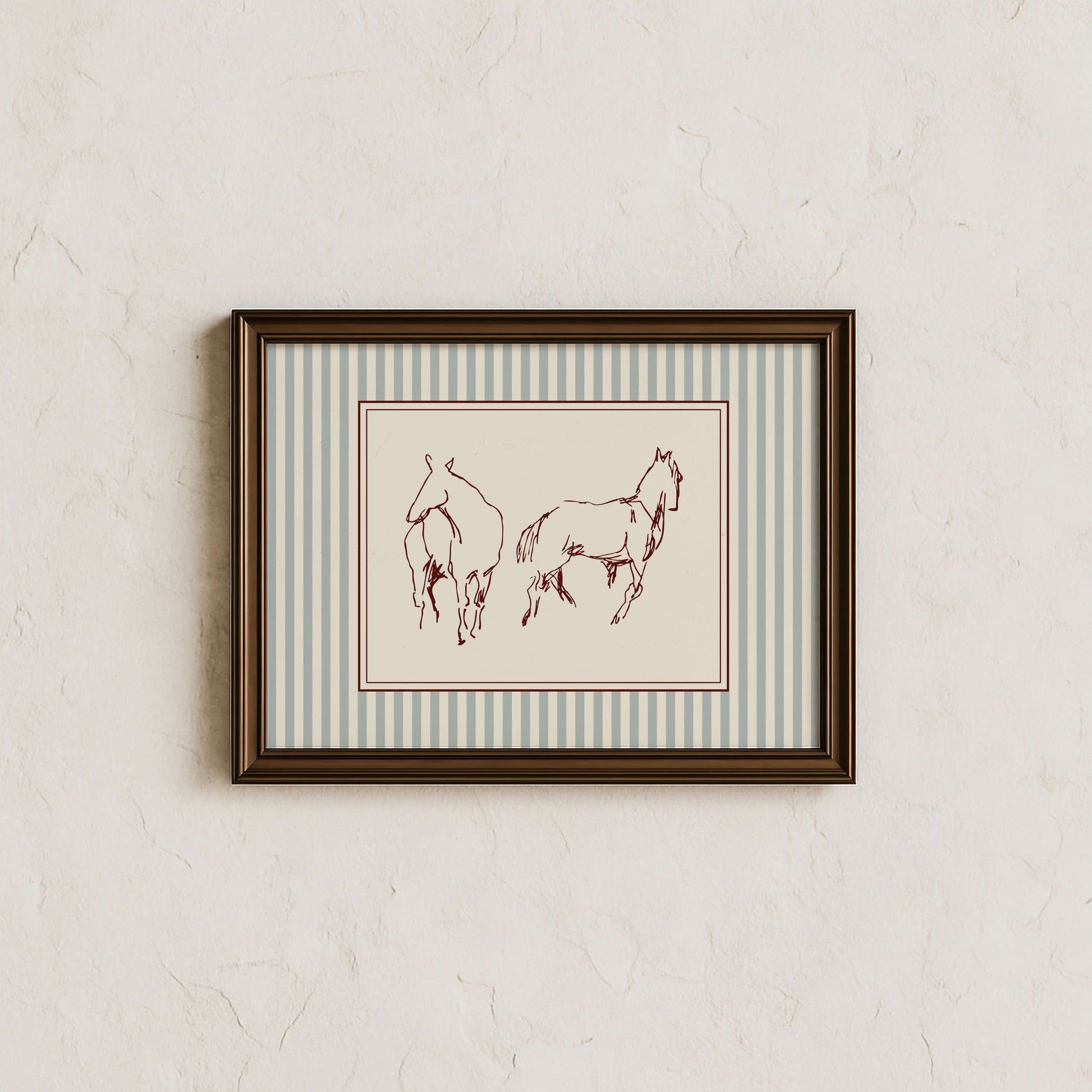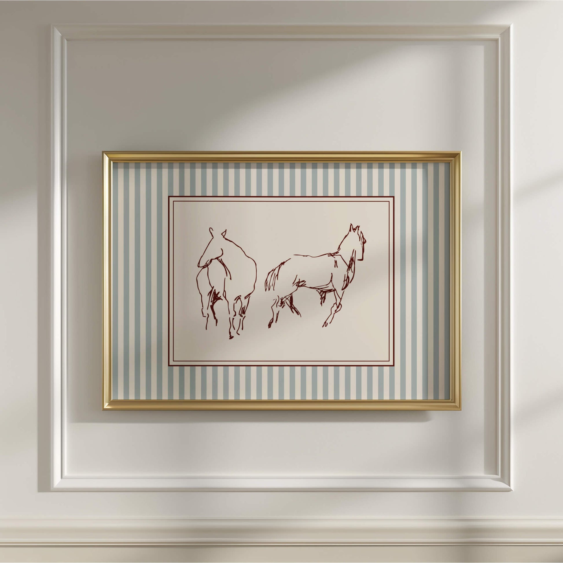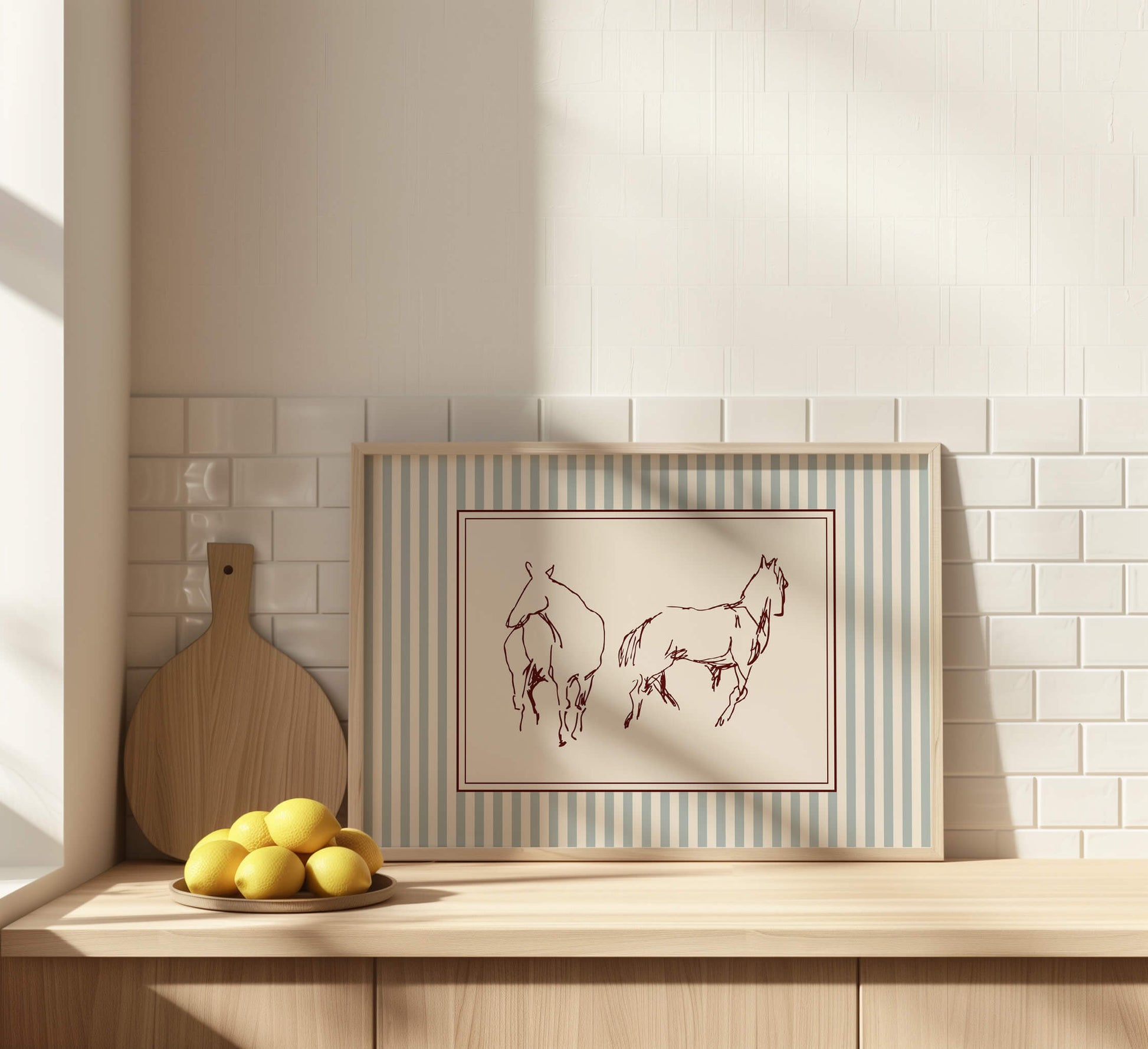Elegant in its simplicity, this minimalist horse illustration brings a serene, rustic charm to any space. Featuring fluid linework in rich red against a neutral background, the artwork is framed by soft blue and cream stripes—perfect for equestrian lovers, cozy cottages, or calming nursery corners.