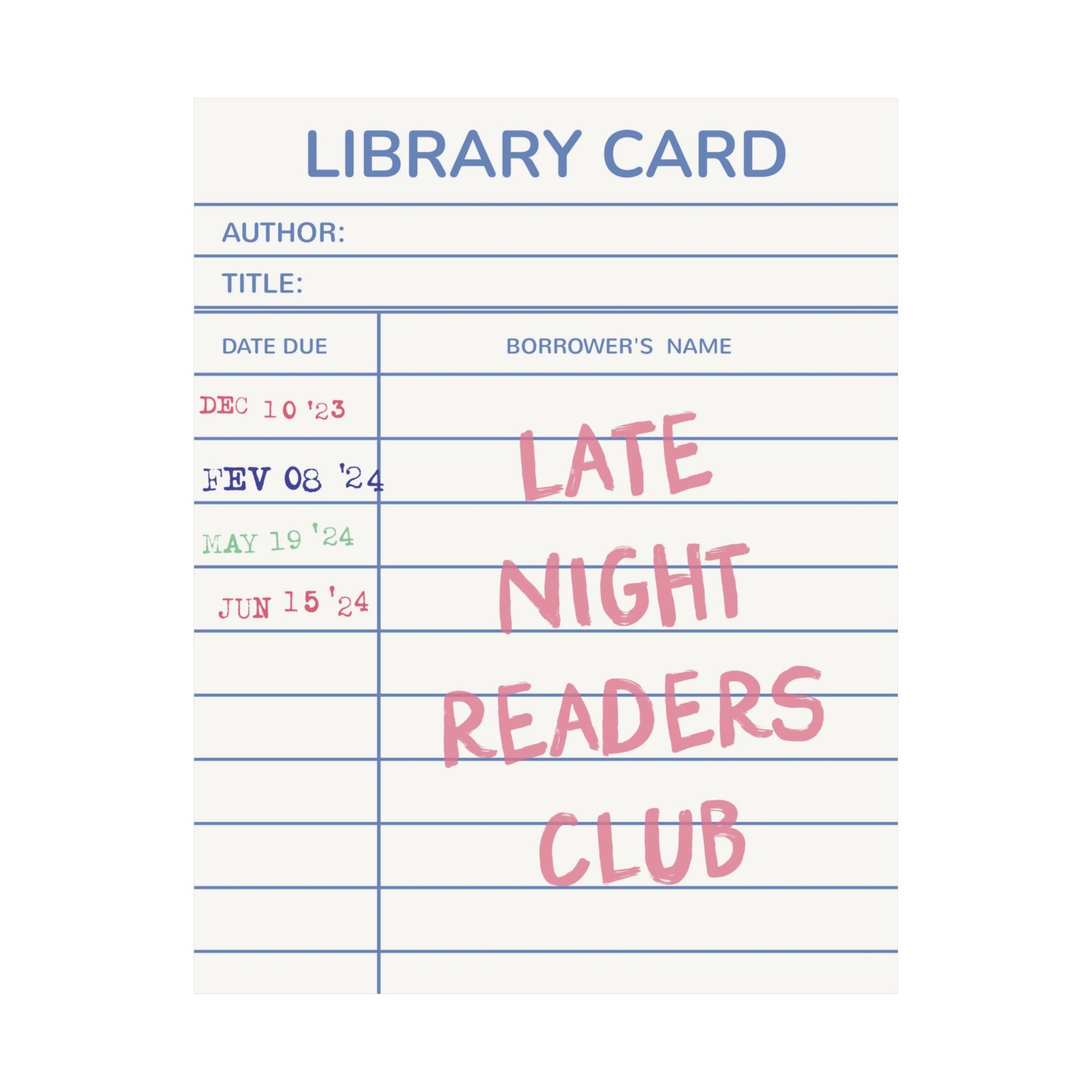 A playful take on a vintage library card, stamped with various due dates and a handwritten note : “late night readers.” Tapping into bookworm nostalgia and the universal struggle of putting a good book down. Perfect for cozy reading corners and literary lovers.