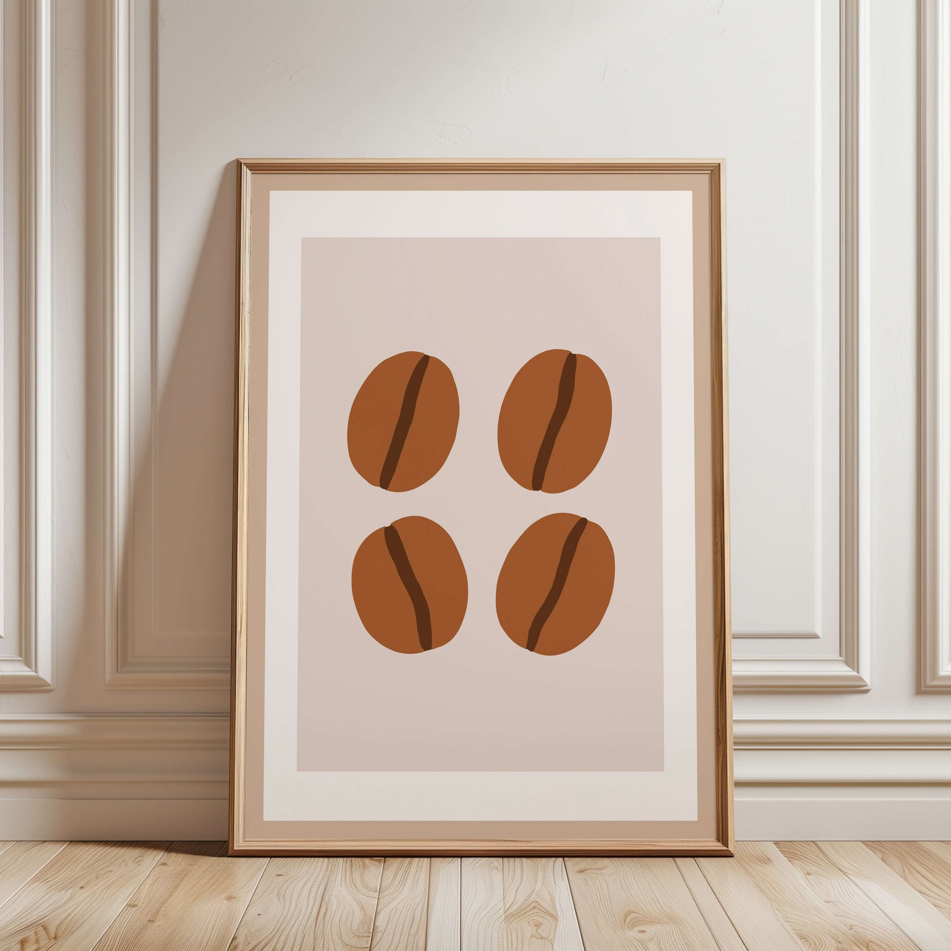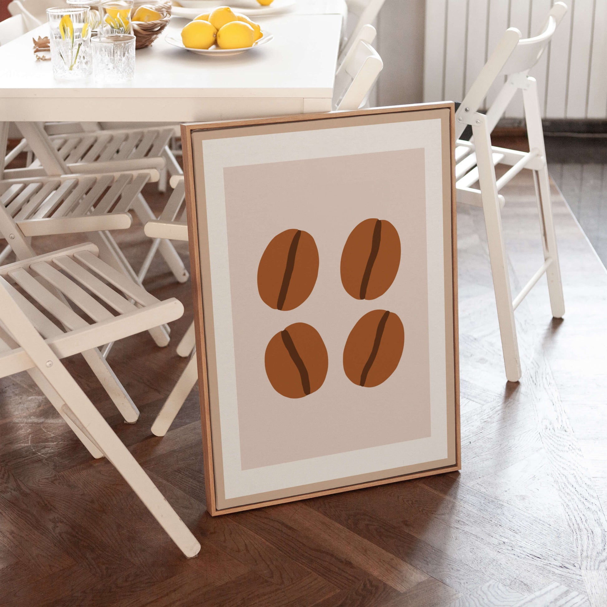Bring a modern, minimalist touch to your kitchen or coffee bar with this stylish coffee beans art print. Featuring four bold coffee beans on a soft tan background, this design is perfect for coffee lovers and anyone who appreciates simple, clean decor. Great for creating a cozy atmosphere, layering into a gallery wall, or gifting to your favorite coffee enthusiast.