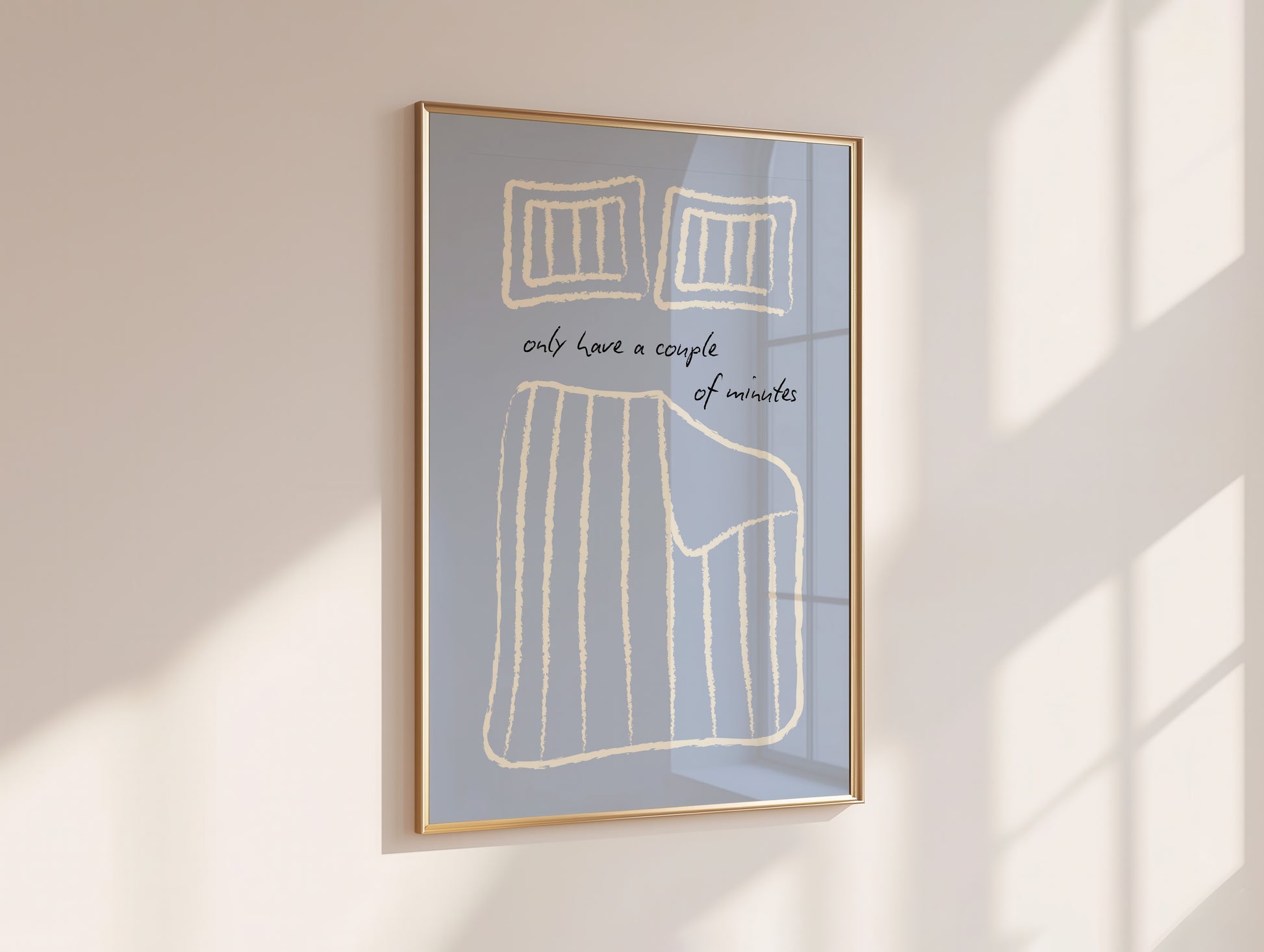 A playful line drawing of an unmade bed with the cheeky phrase “only have a couple of minutes.” Minimal, humorous, and a little bit mischievous. Great for bedrooms, guest rooms, or modern gallery walls.