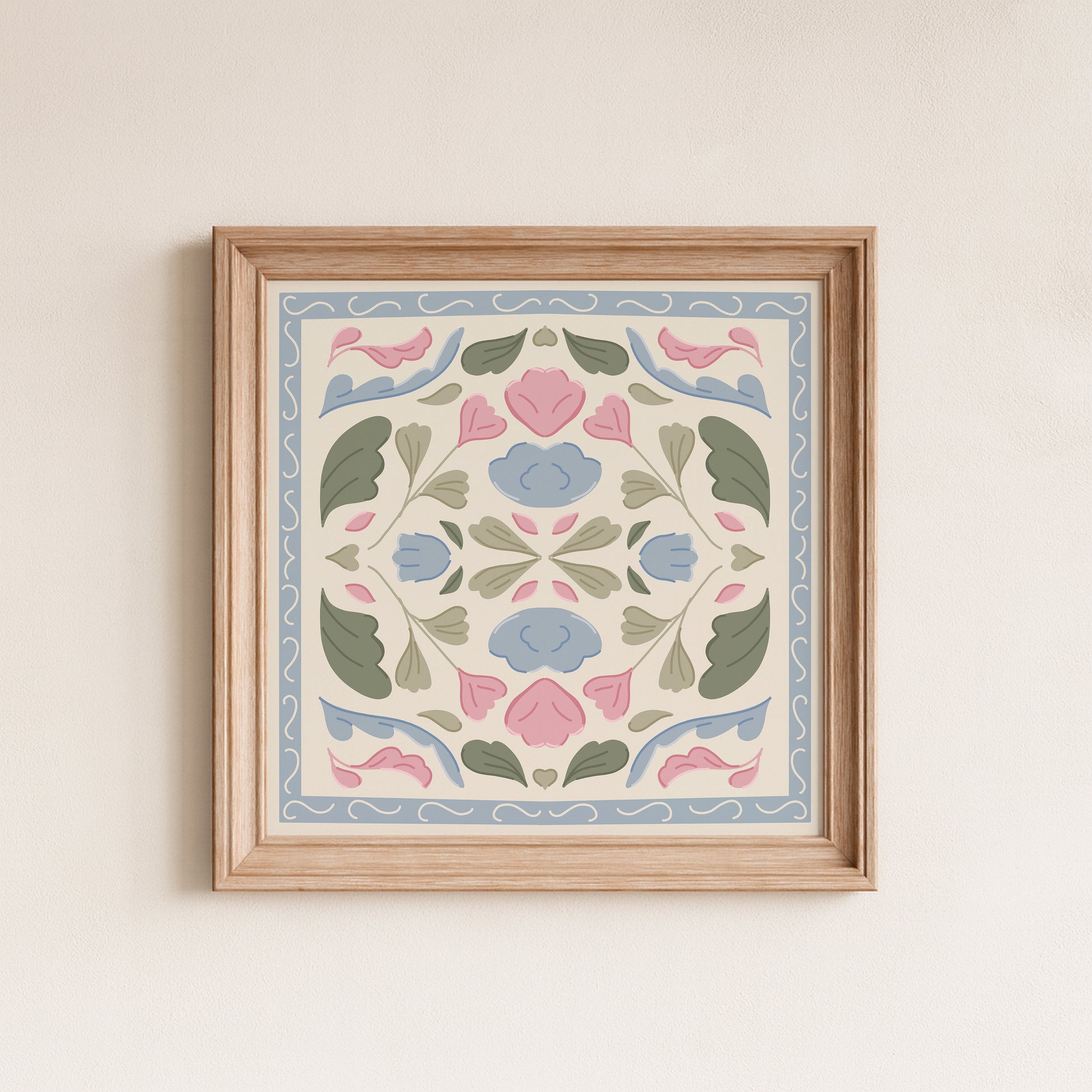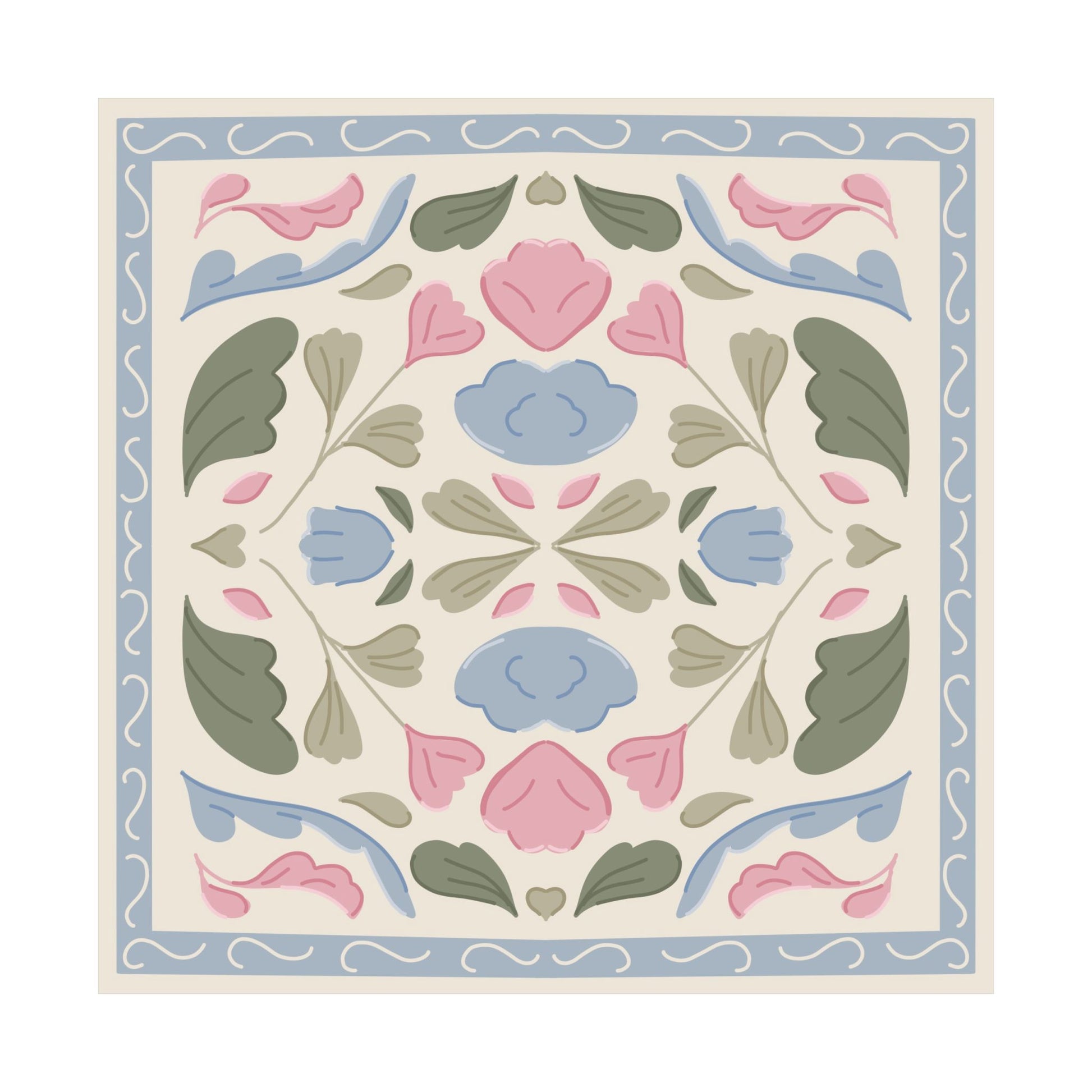 Bring a touch of vintage whimsy and botanical charm to your space with this floral quilt print. Featuring a soft symmetrical arrangement of pastel flowers in pink, blue, and sage green, framed by a scalloped soft blue border, this piece is perfect for nurseries and gallery walls. Its quilt inspired symmetry and soft color palette make it a timeless choice for floral lovers and cozy-core collectors alike.