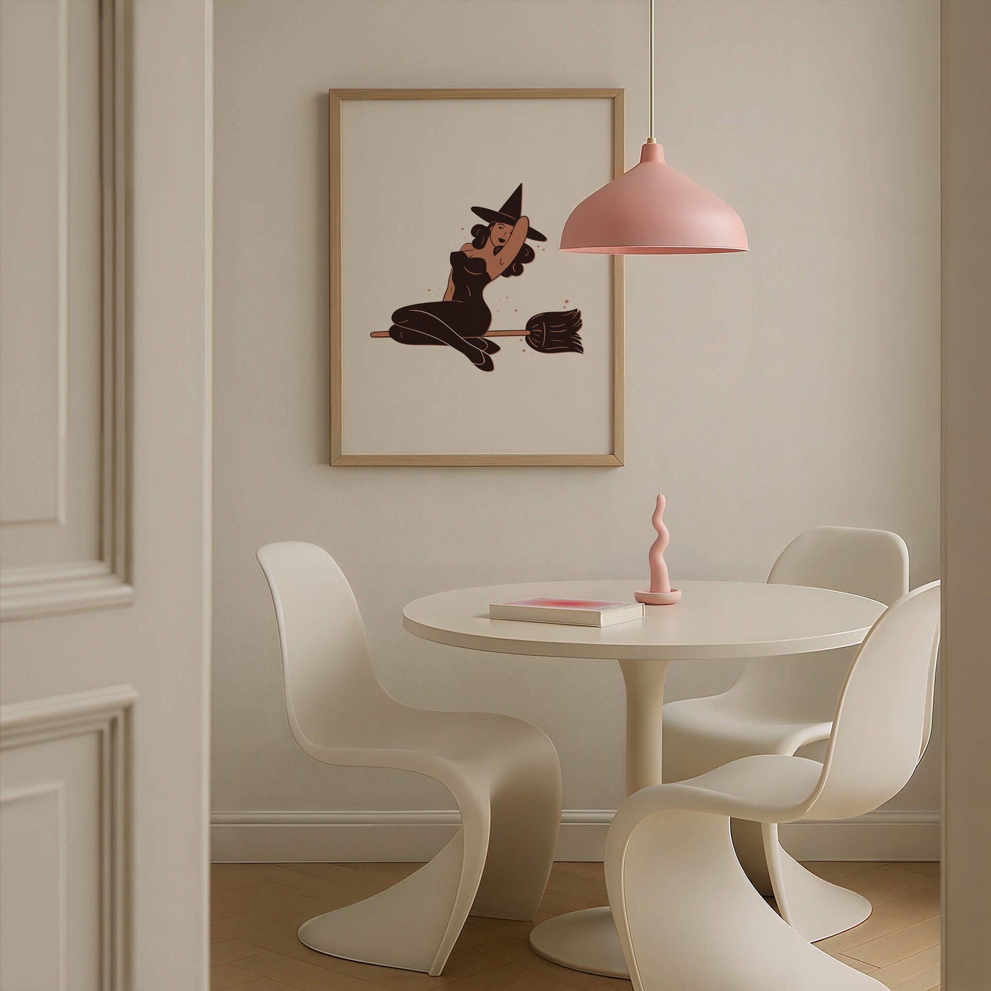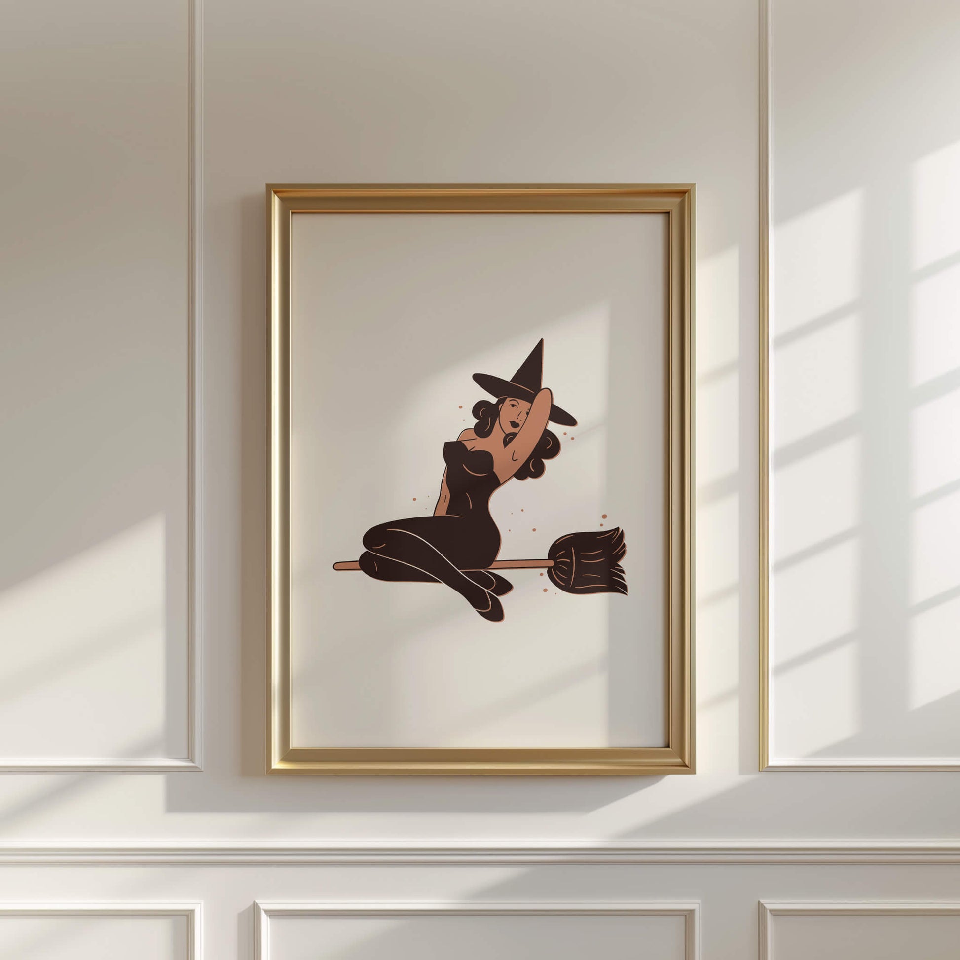 Add a playful dose of vintage glamour to your decor with this retro pinup witch poster. Featuring a stylish witch perched on her broom, this artwork is perfect for Halloween, witchy gallery walls, or anyone who loves a bit of old Hollywood charm.