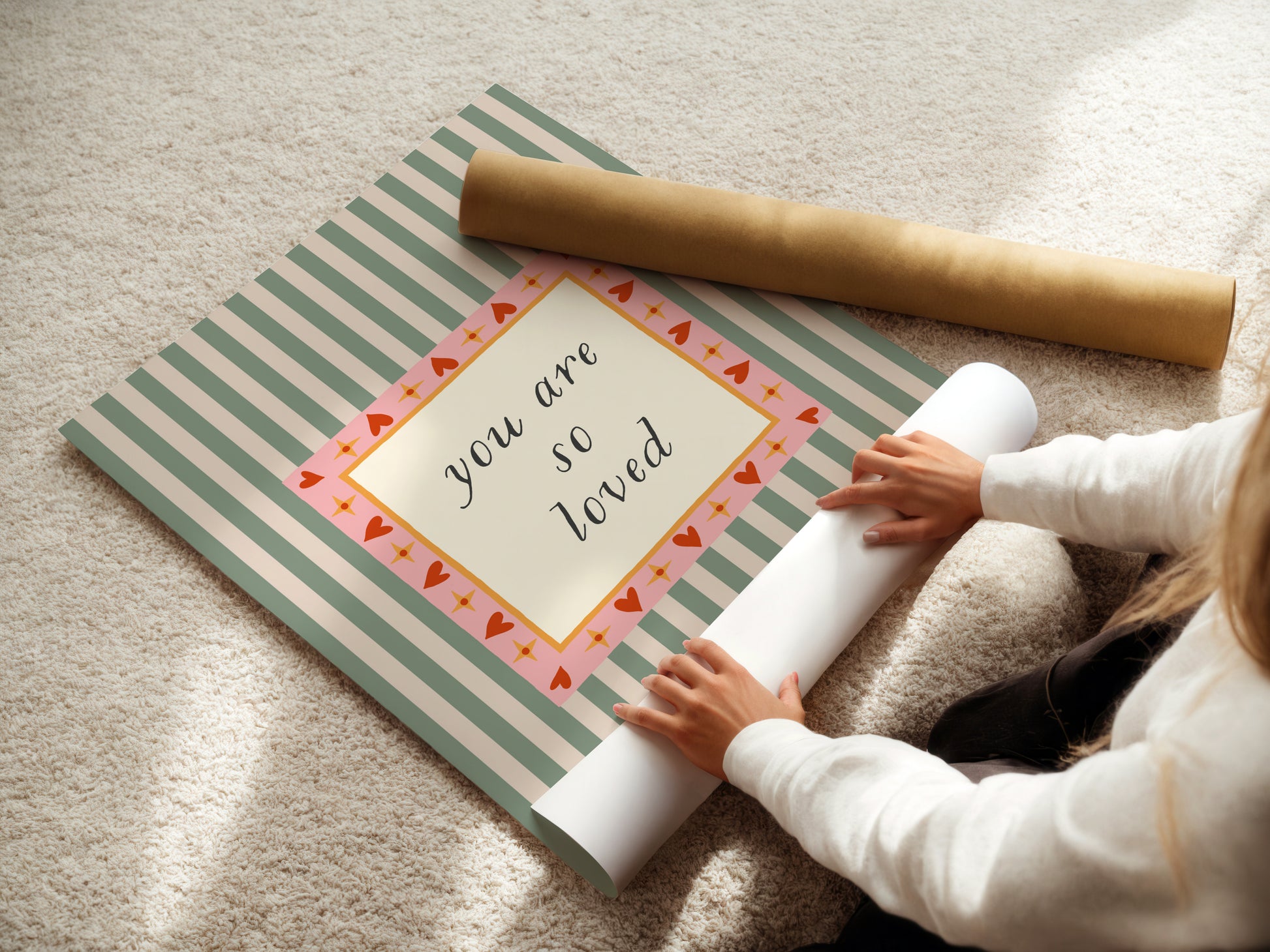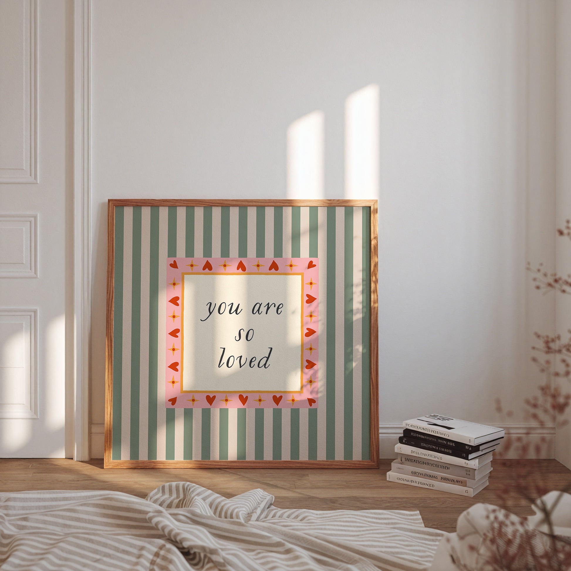 A joyful, love soaked message for your little one to see every day. “you are so loved” is hand lettered in a classic script and framed by a vibrant pink and red heart border with golden stars. The background’s sage green stripes add a vintage touch, balancing whimsy and warmth. Perfect for a nursery, toddler room, or gallery wall, this print is a beautiful reminder that love is always in the air (and on the wall).