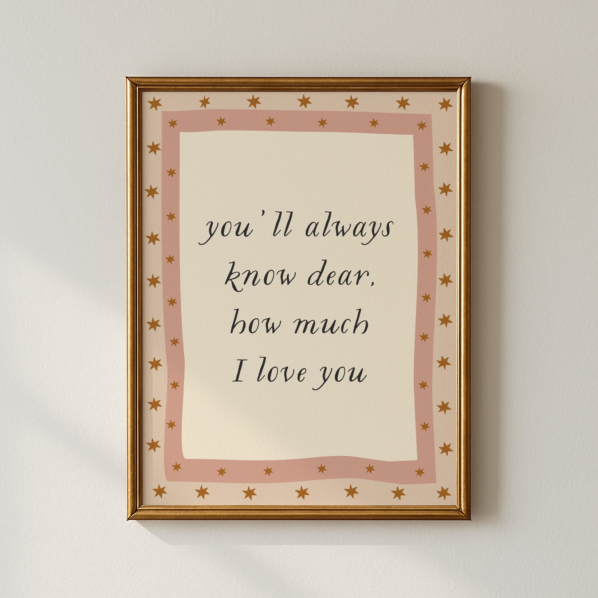 Sweet and sentimental, this nursery wall art features the phrase “you’ll always know dear, how much I love you” in elegant script, surrounded by a soft pink border and twinkling mustard stars. It’s a tender, dreamy reminder of how deeply they’re loved — perfect for a nursery, baby shower gift, or calming corner of a little one’s room. With its retro inspired palette and wavy frame detail, it adds both warmth and a touch of vintage sweetness.