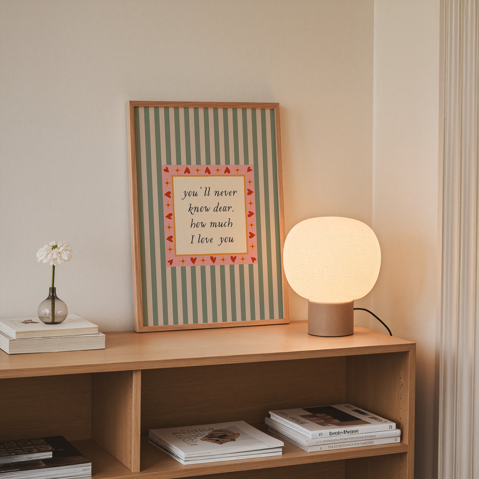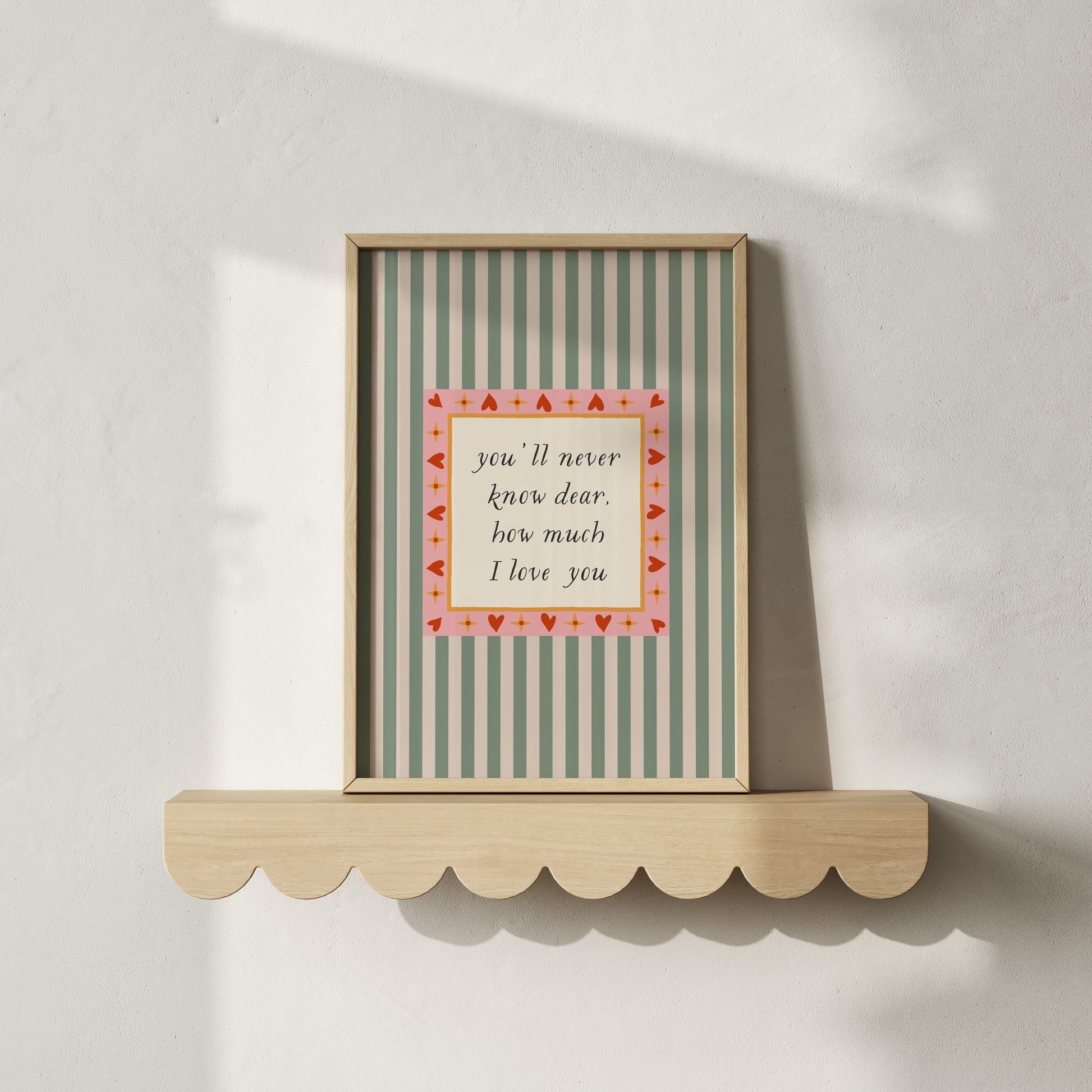 A tender message from a timeless lullaby, this print reads: “you’ll never know dear, how much I love you.” Hand lettered in a flowing script and framed by a cheerful border of red hearts and golden stars, it sits atop soft sage green stripes for a vintage inspired look. Sweet, sentimental, and full of love—this piece is a heartfelt addition to nurseries and kids' rooms.